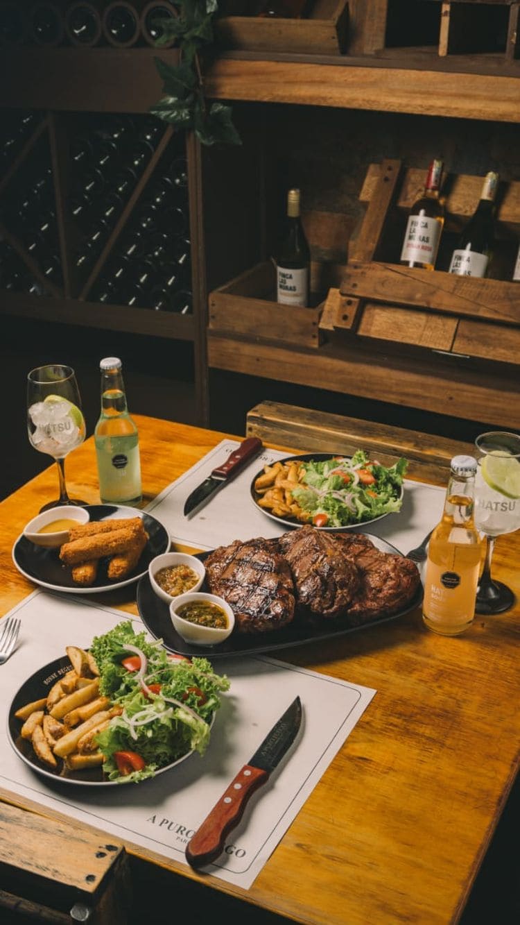 -Ojo de bife Brangus 800 gr con maduración de 25 días, (este corte es para 2 personas, constituye los 2 platos fuertes debido al tamaño del corte) acompañado de papas francesas rusticas y ensalada de lechuga, tomate, cebolla y vinagre balsámico.