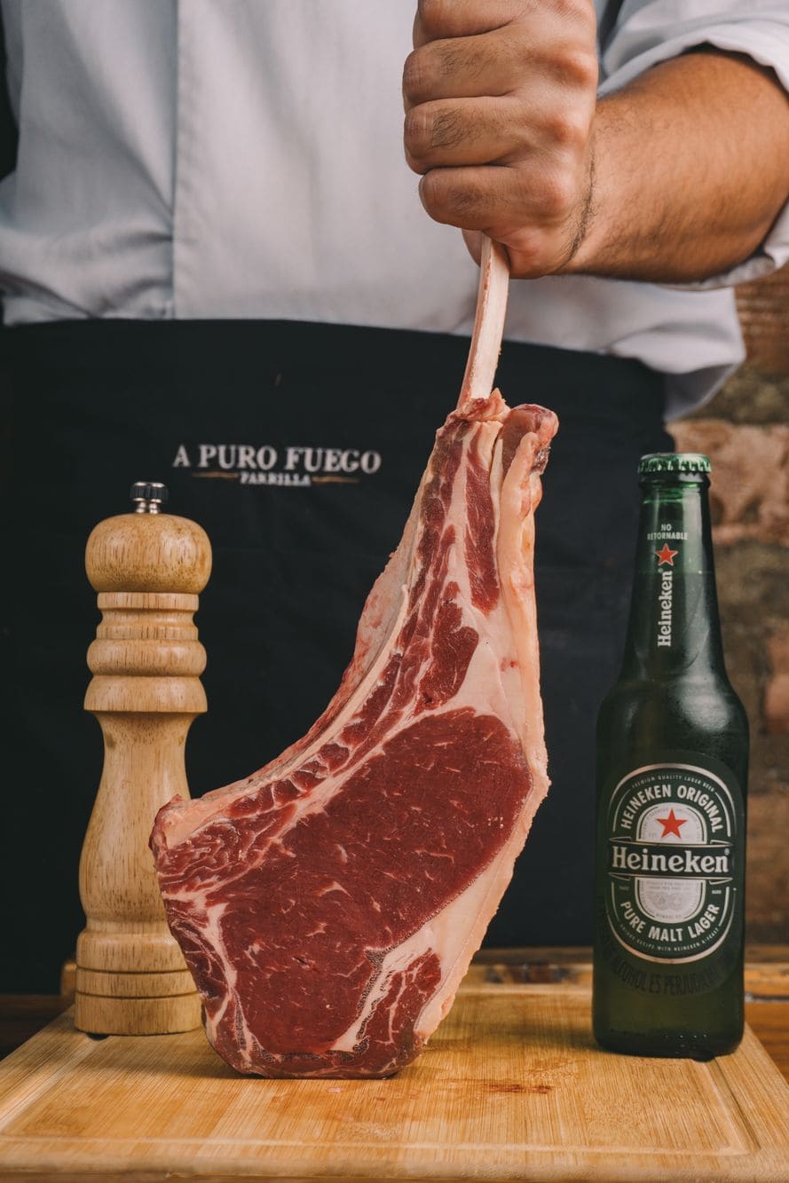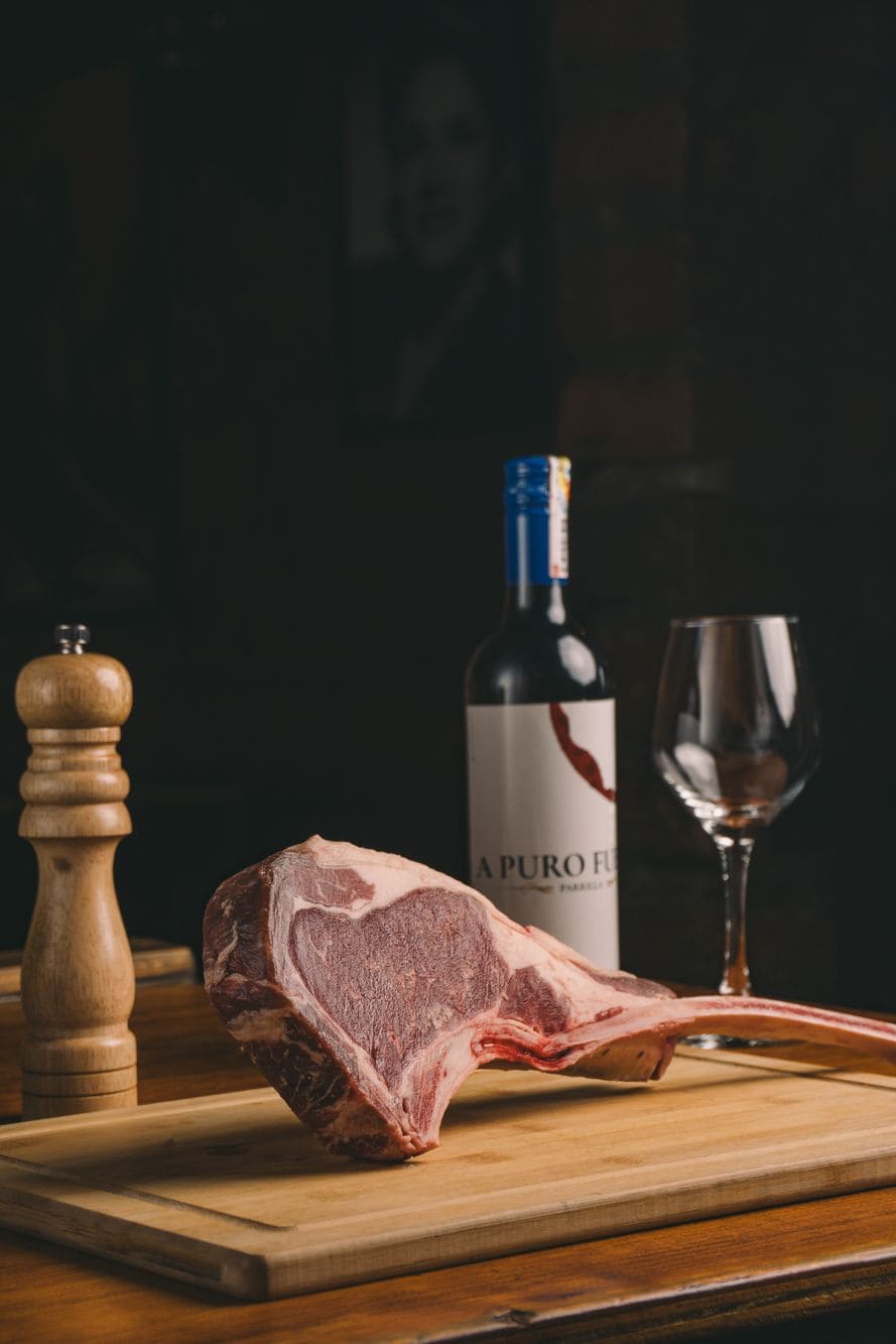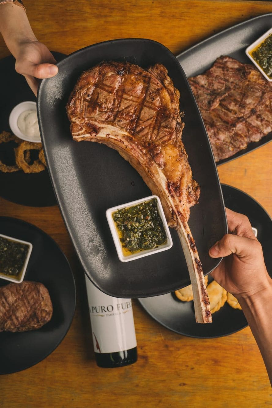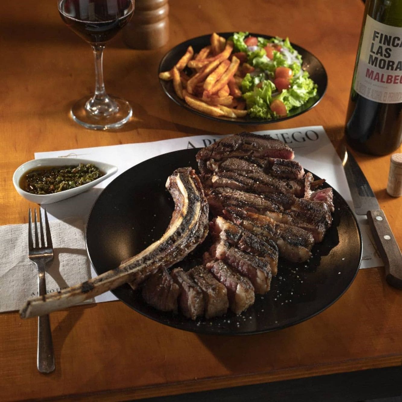 -Tomahawk Brangus 800 gr con maduración de 25 días, (este corte es para 2 personas, constituye los 2 platos fuertes debido al tamaño del corte) acompañado de papas francesas rusticas y ensalada de lechuga, tomate, cebolla y vinagre balsámico.