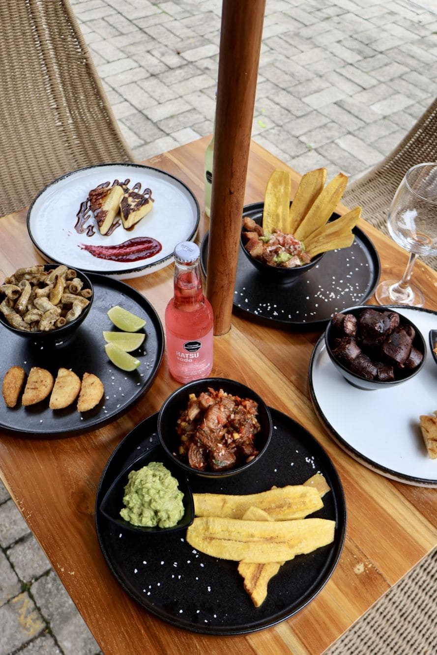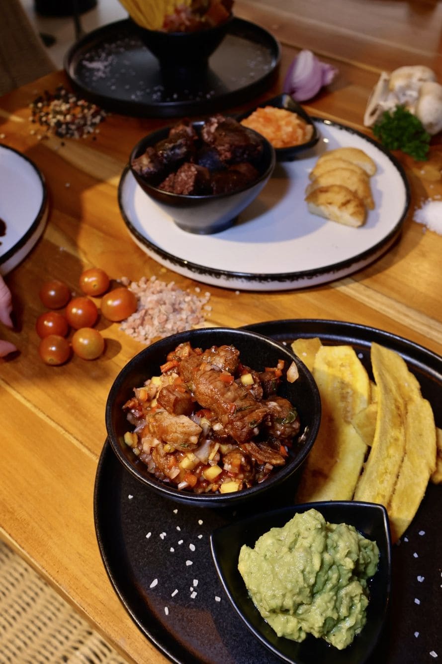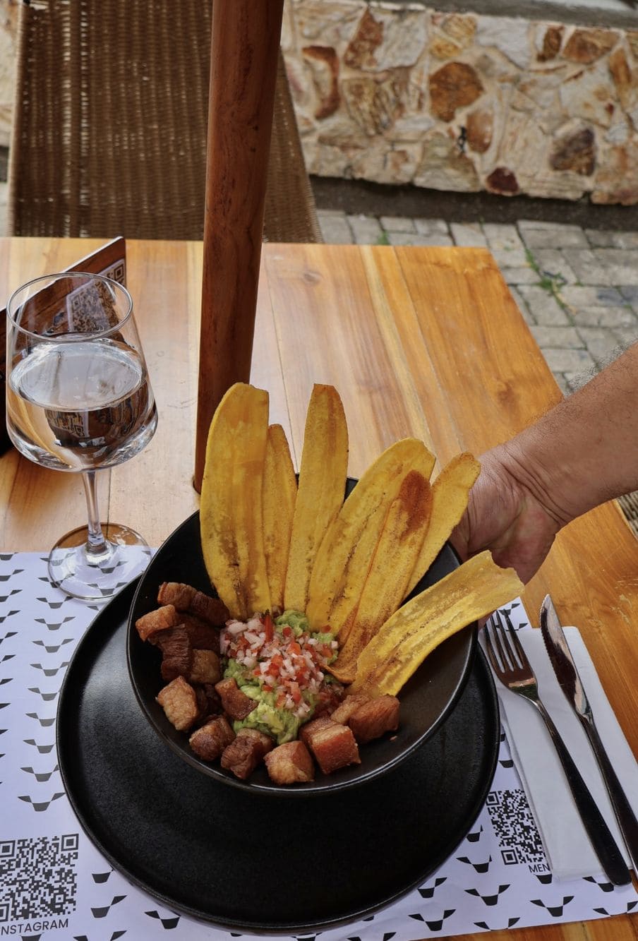 - Ceviche de chicharrón: Cebolla roja, cilantro, limón, miel y mango con chip de platano