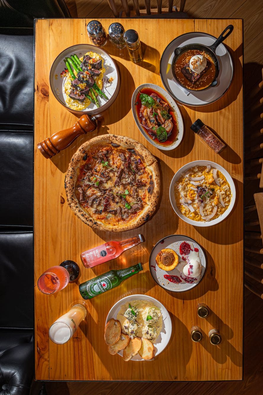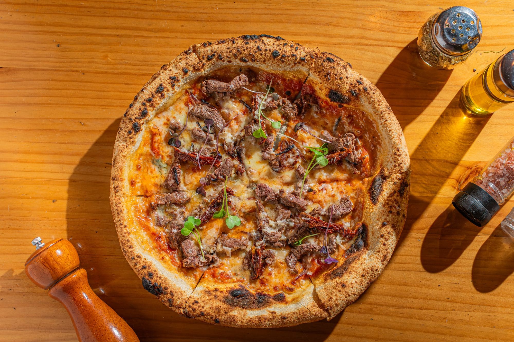 - Pizza solomito: Pizza artesanal con base Ámsterdam y salsa pomodoro, cubierta con mozzarella fundida, tomates deshidratados y solomito en finos cortes. Se realza con mantequilla de ajo y romero, cebolla puerro, un toque de queso azul y brotes orgánicos.