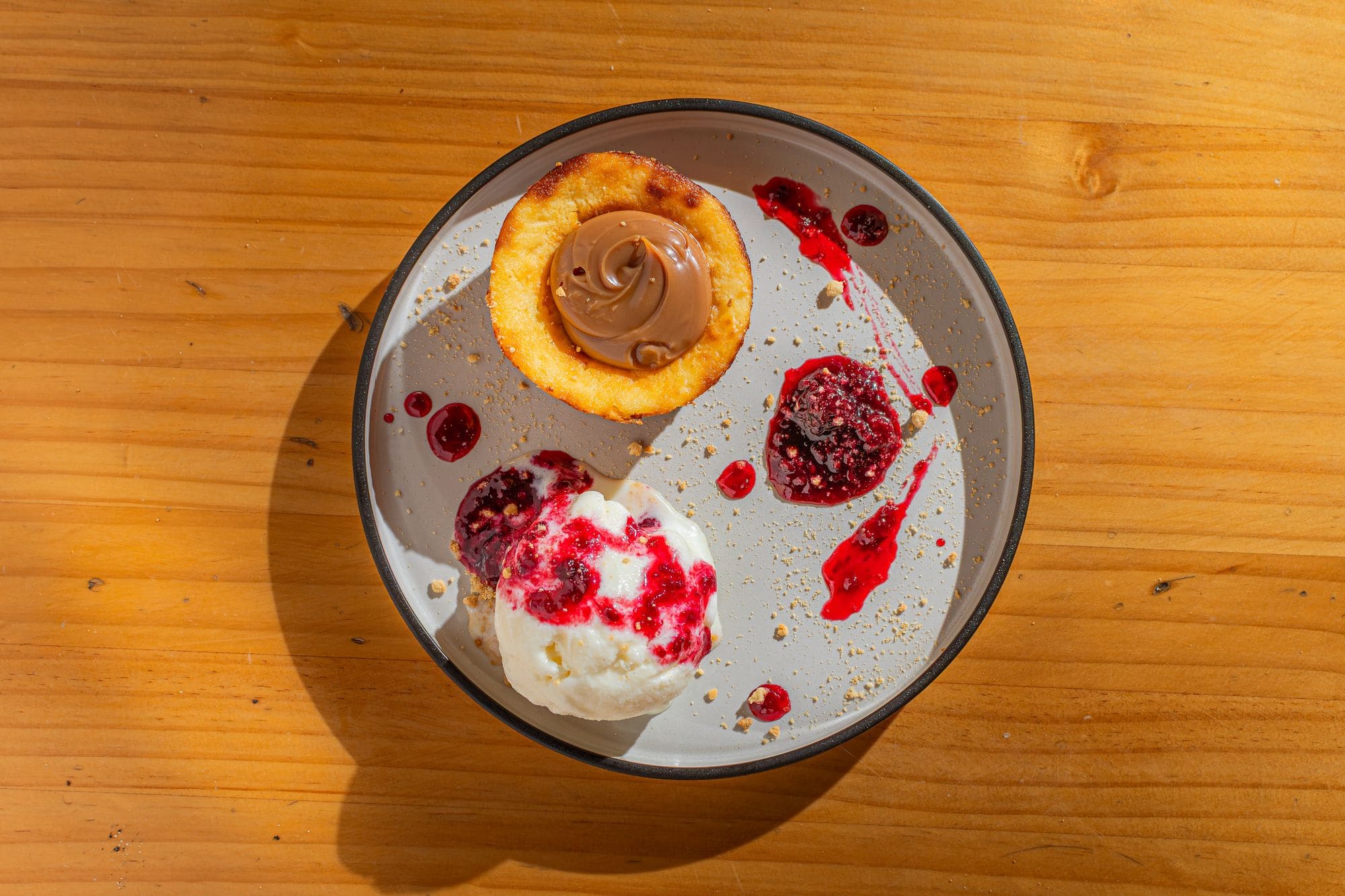 - Cheesecake de arequipe: Cheesecake de arequipe sobre galleta triturada, acompañado de una reducción de mora que equilibra dulzura y acidez, finalizado con una cremosa bola de helado de vainilla.