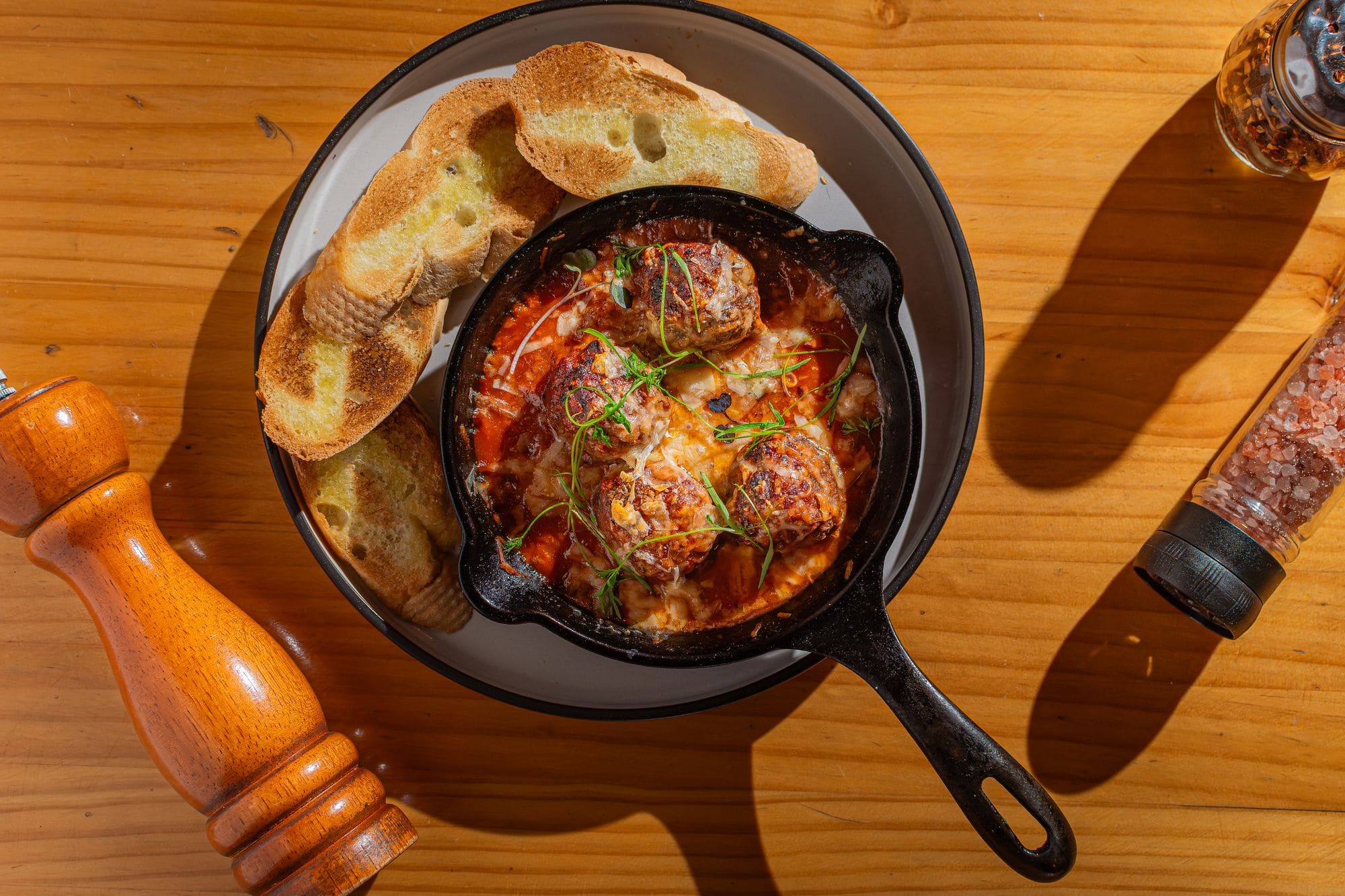- Albóndigas italianas: Albóndigas en salsa pomodoro, parmesano en escamas, vino tinto, acompañadas de pan baguette crujiente.