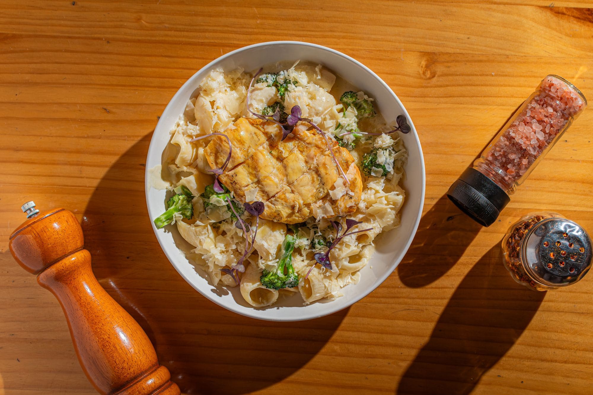 - Rigatoni en salsa de queso azul y suprema de pollo 200 gr: Rigatoni bañado en una cremosa salsa de queso azul, que se realza con la jugosidad de una suprema de pollo. Acompañado de brócoli fresco, brotes orgánicos y un toque de parmesano en escamas.