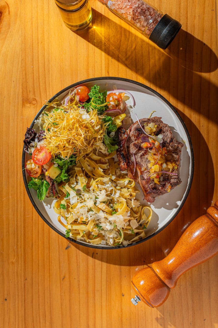 - Mixto de bife 180 gr: Chata de res parrillada en nuestro horno de brasas con salsa criolla artesanal. Acompañada de fetuccini en reducción de mantequilla y vino blanco, finalizada con queso parmesano en escamas. La frescura la aporta una ensalada fresca con aguacate terminada con puerro crocante y vinagreta de la casa.