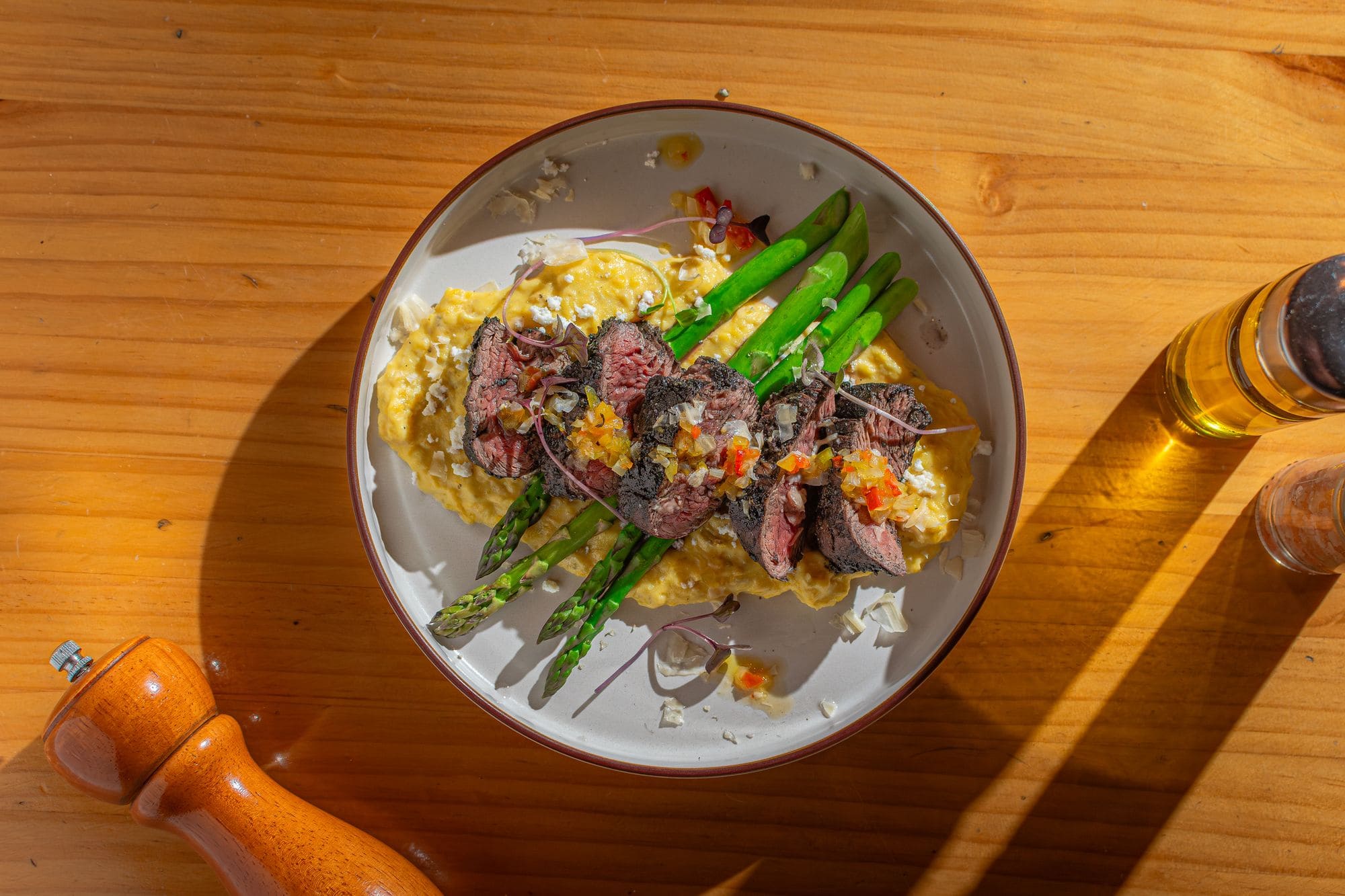- Lomo oscuro: 220g de corte premium de solomito, sazonado con nuestro rub de especias negras que realzan su sabor intenso. Servido con puré cremoso de plátano maduro y papa criolla, espárragos verdes al punto y un delicado toque de parmesano y brotes frescos.