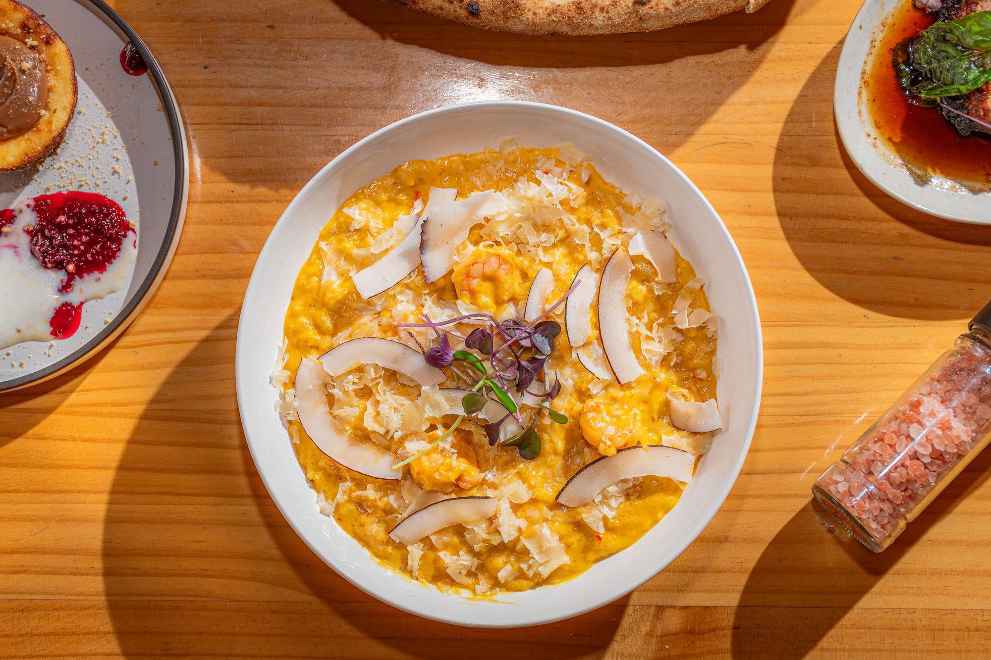 - Risotto coco y camarones: 180g de risotto elaborado con bisque y base de coco, perfumado con ají dulce y vino blanco. Se acompaña de camarones, picadillo di mare, y coronado con parmesano en escamas, coco deshidratado y brotes orgánicos.