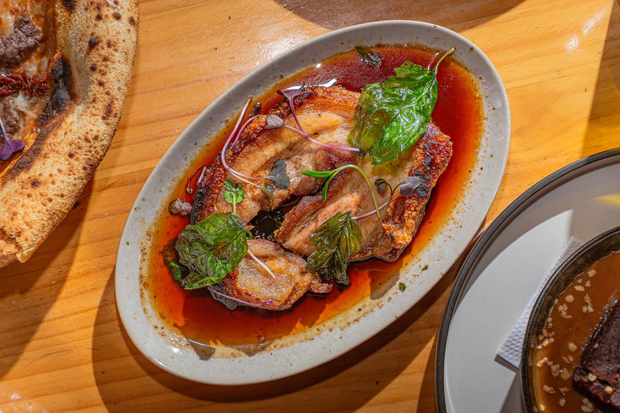 - Porchetta rostizada con especias: Porchetta rostizada lentamente con especias, servida con una delicada salsa de su propio jugo, perfumada con albahaca fresca y acompañada de brotes orgánicos.