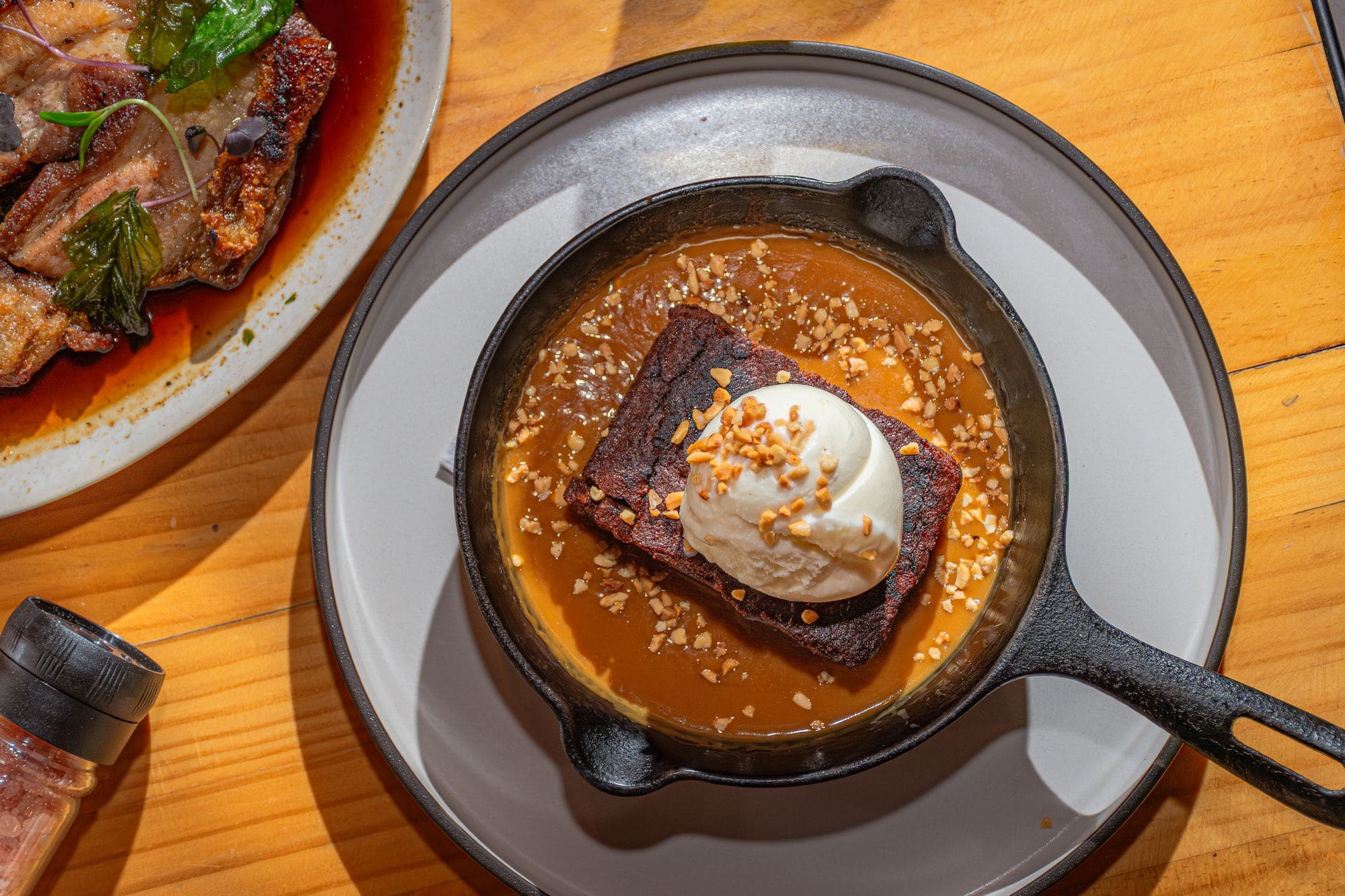 - Brownie con arequipe: Delicioso brownie de chocolate melcochudo, crujiente por fuera y suave por dentro, acompañado de salsa de arequipe, finalizado con 1 bola de helado de vainilla y maní triturado.