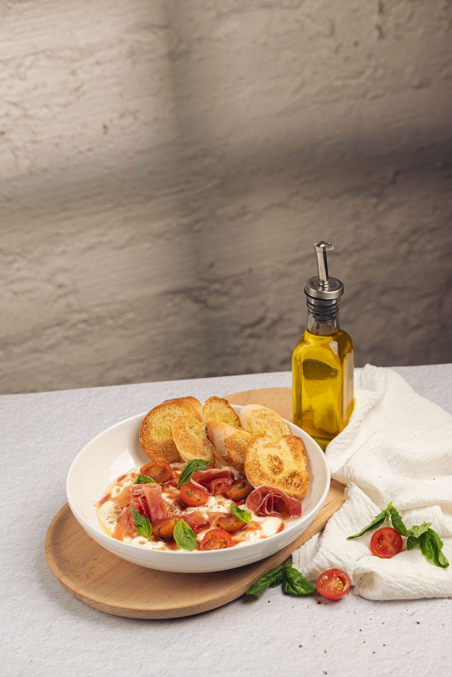 - Stracciatella y uva isabel: Cremosa stracciatella acompañada de compota de uva Isabel. tomate cherry y albahaca fresca y jamón serrano, toque de pimienta negra. Acompañada con pan baguette artesanal.