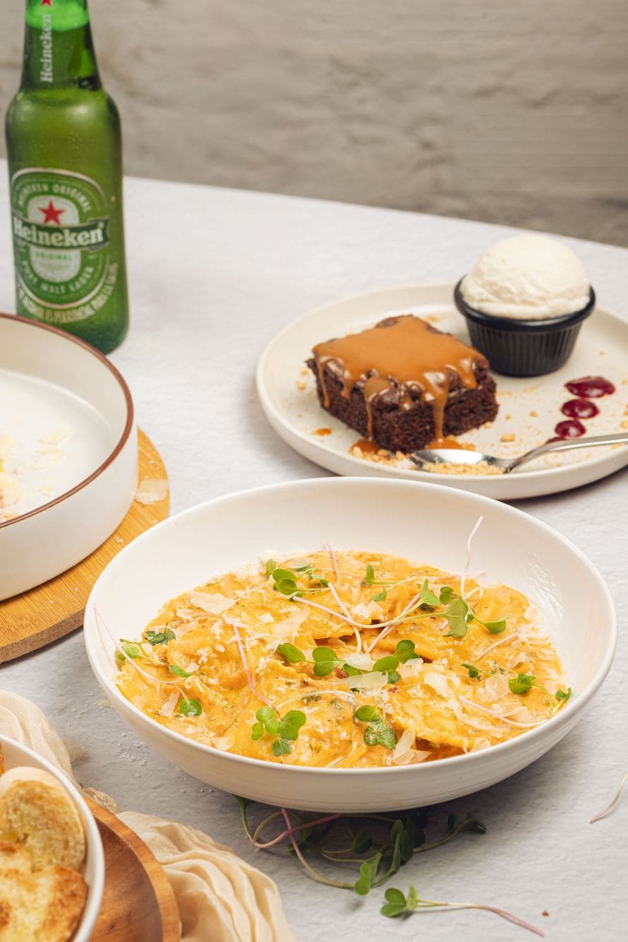 - Ravioles serrano al vodka: Ravioles rellenos de jamón serrano en salsa rose al vodka con peperon chino y terminado con parmesano en escamas, perejil crespo y brotes orgánicos.