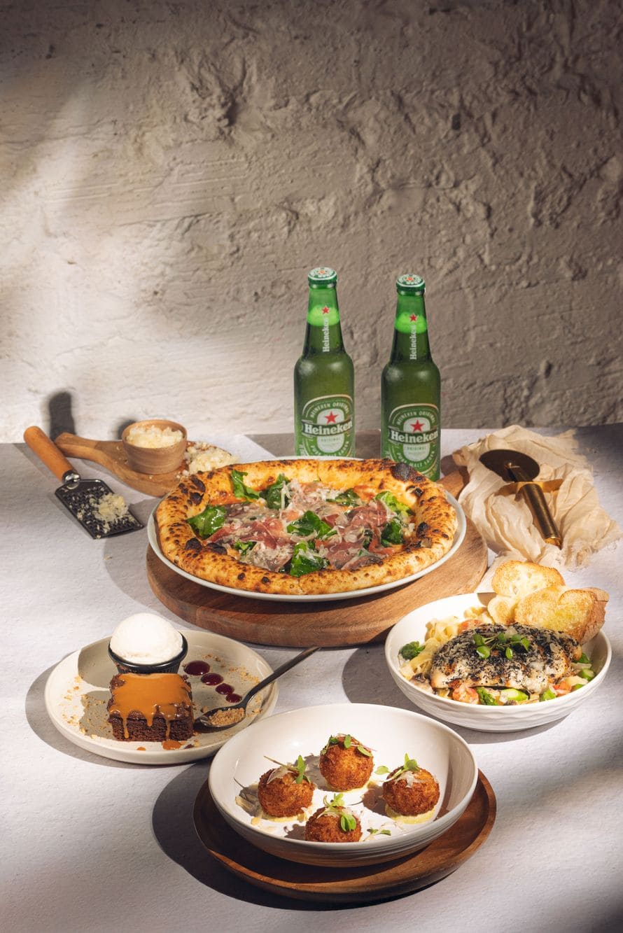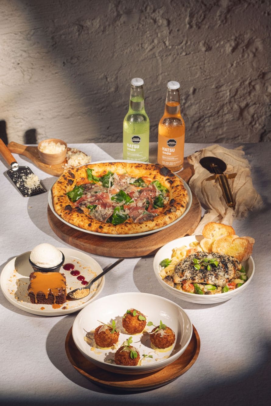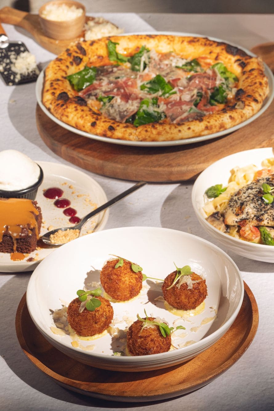 - Arancinis de queso azul y tocineta: Crujientes arancini rellenos de intenso queso azul y tocineta, acompañados de salsa pomodoro de cocción lenta. Terminados con queso parmesano en escamas, brotes orgánicos frescos y un toque de sal. Servidos en salsa tártara para equilibrar cada bocado.