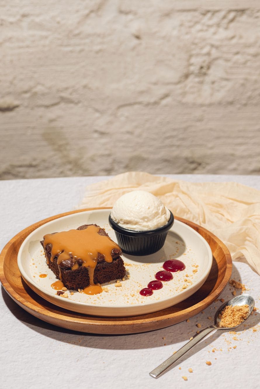 - Torta de chocolate húmeda: Torta de chocolate melcochuda bañada en salsa de arequipe hecha en casa y helado de vainilla.