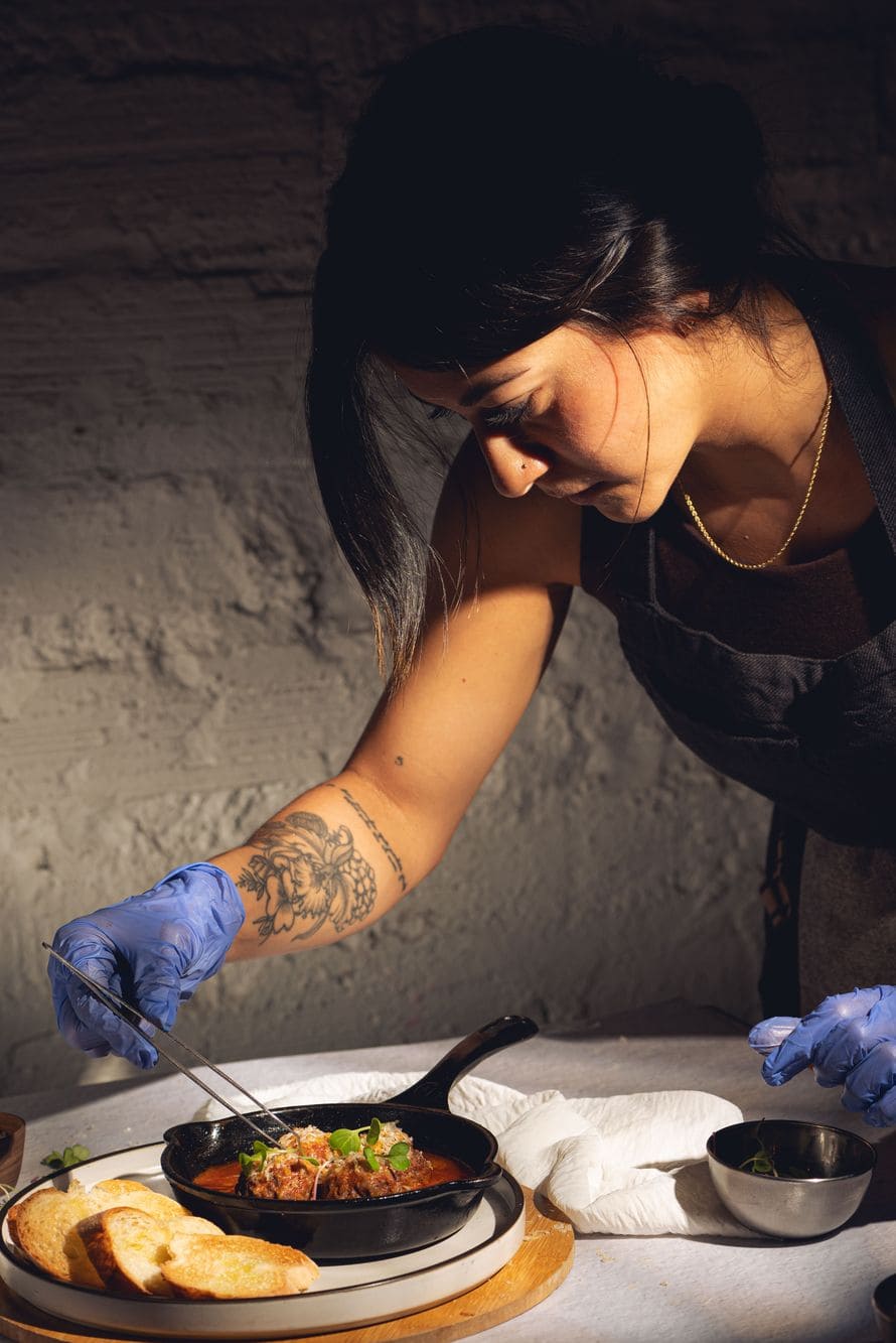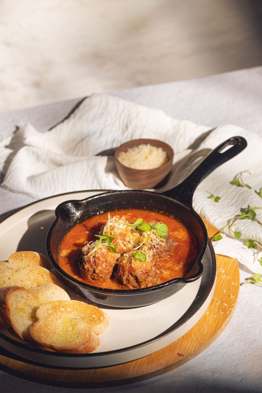 - Albóndigas Italianas: Albóndigas 100% de res bañadas en salsa Pomodoro de la casa, queso parmesano en escamas, vino tinto y brotes orgánicos; acompañadas de pan de baguette.