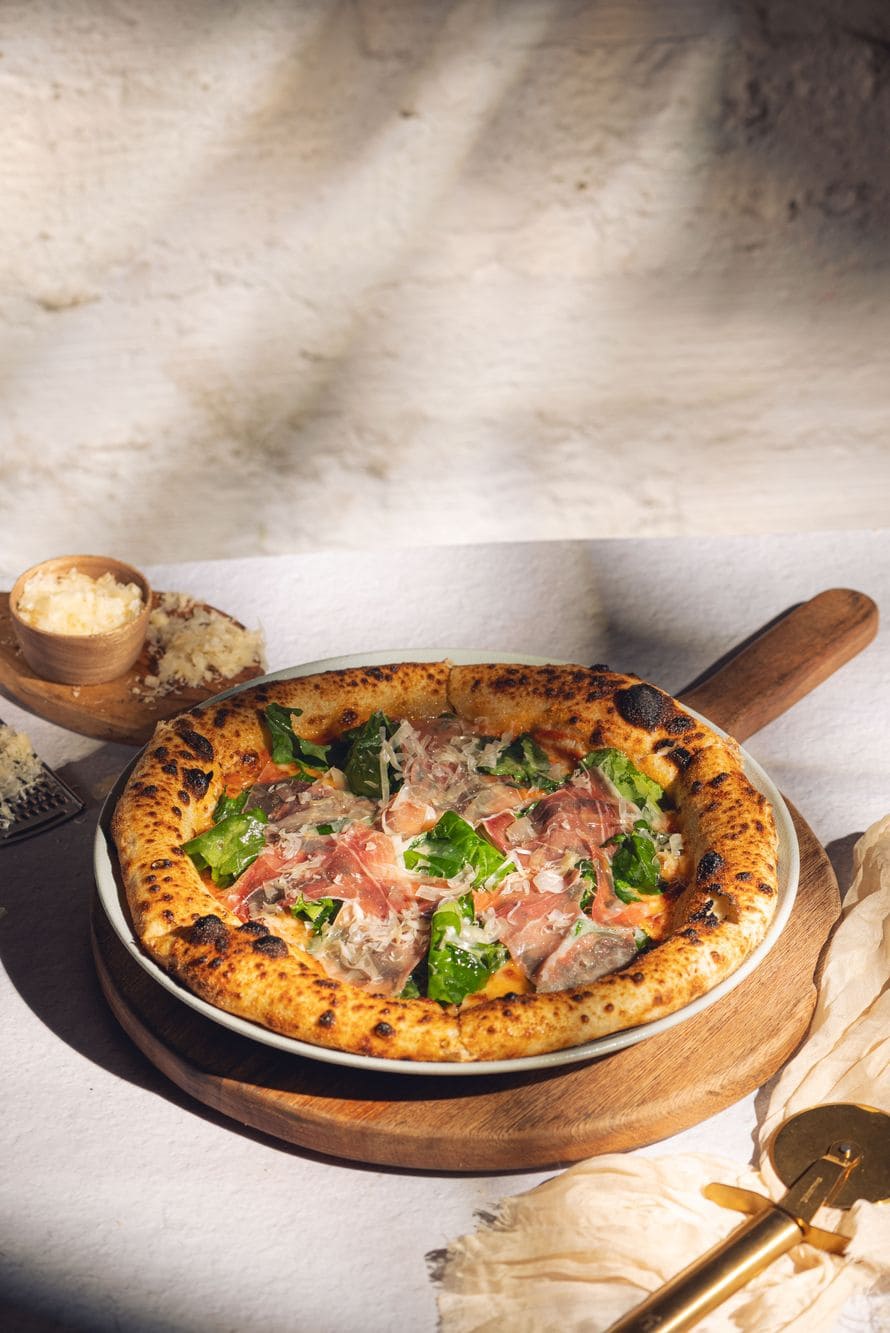 - Pizza de prosciutto, rúgula y parmesano: Base pomodoro, lonjas de prosciutto, rúgula y parmesano rayado