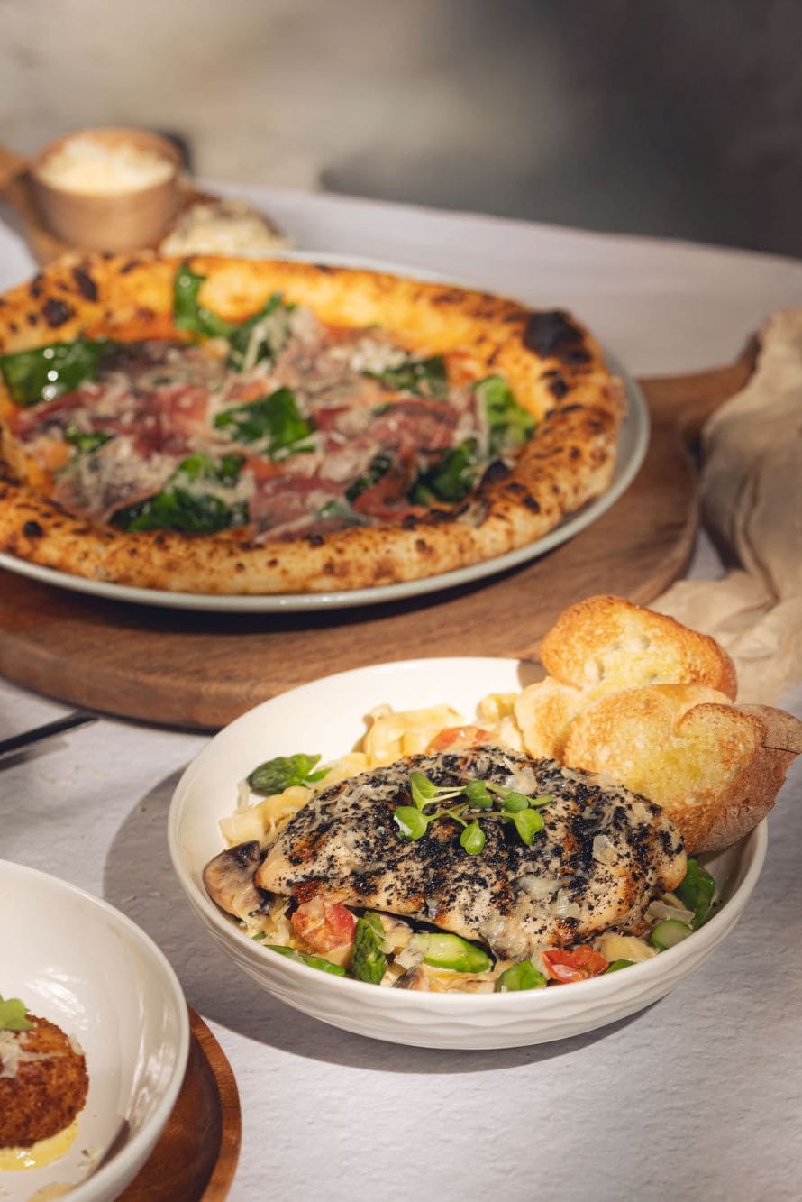 - Fettuccine nero di pollo 200g: Pasta fettuccine combinada con pollo encostrado en un blend de especias y carbón activado, salteada con espárragos verdes, coliflor, champiñones y tomate cherry. Bañada en cremosa salsa Alfredo, terminada con parmesano en escamas y brotes orgánicos. Acompañada de pan baguette artesanal.