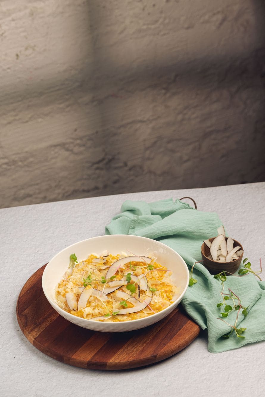 - Risotto coco y camarones: Camarones salteados al ajillo, vino blanco, ají dulce y leche de coco, queso parmesano, coco crujiente.