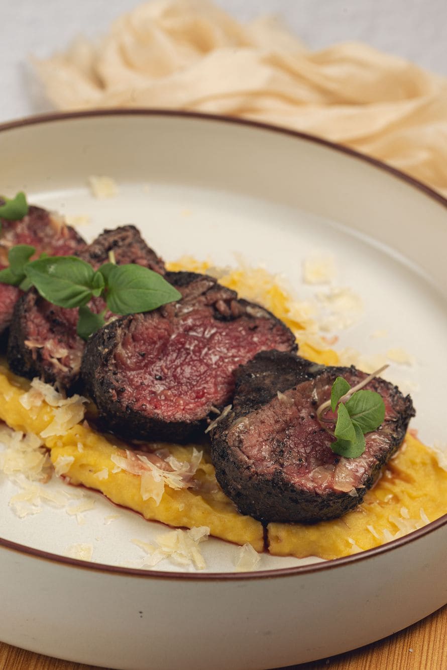 - Lomo oscuro (220g): Solomito encostrado en un blender de especias negras con mostaza ahumadas servido sobre una cama de puré de plátano maduro y papa criolla, culminado con parmesano en escamas.