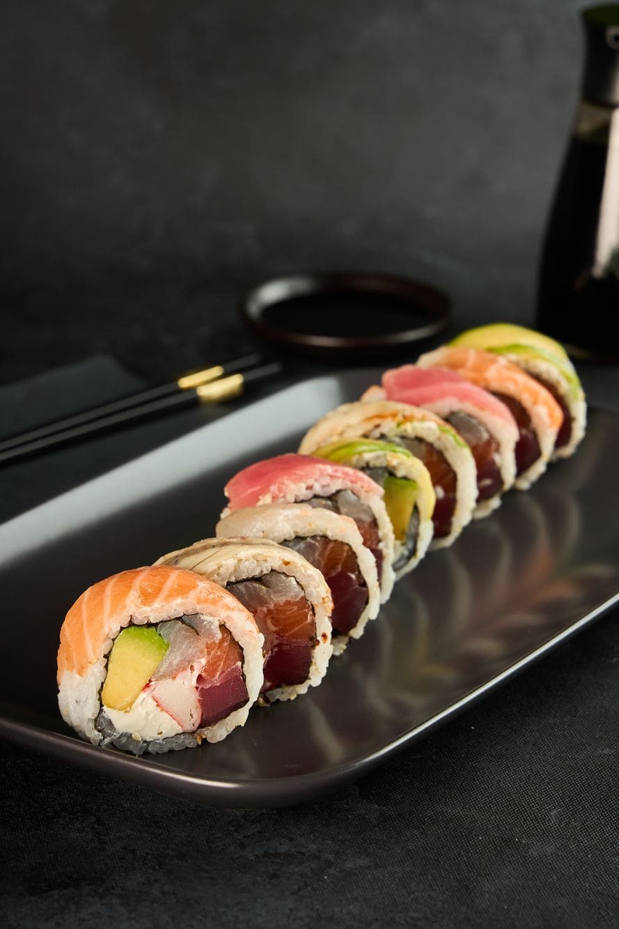 - Roll premium: Relleno de palmito de cangrejo, salmón, atún, tilapia, queso philadelphia, aguacate, cubierto anguila, atún, salmón, tilapia y aguacate.