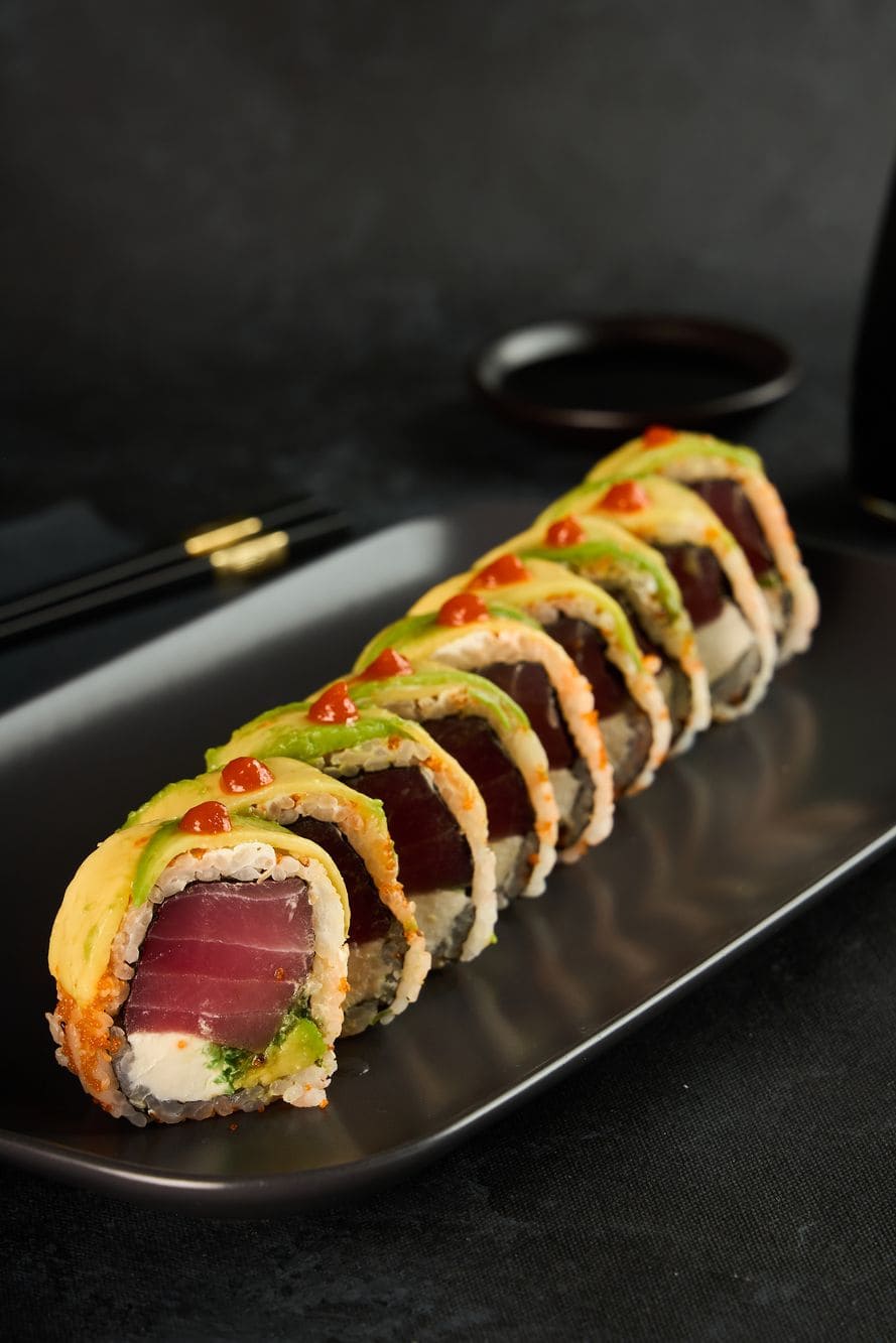 - Roll Spicy tuna: Roll relleno de atún fresco, srirasha, wakame, aguacate y queso philadelphia cubierto de masago y aguacate.