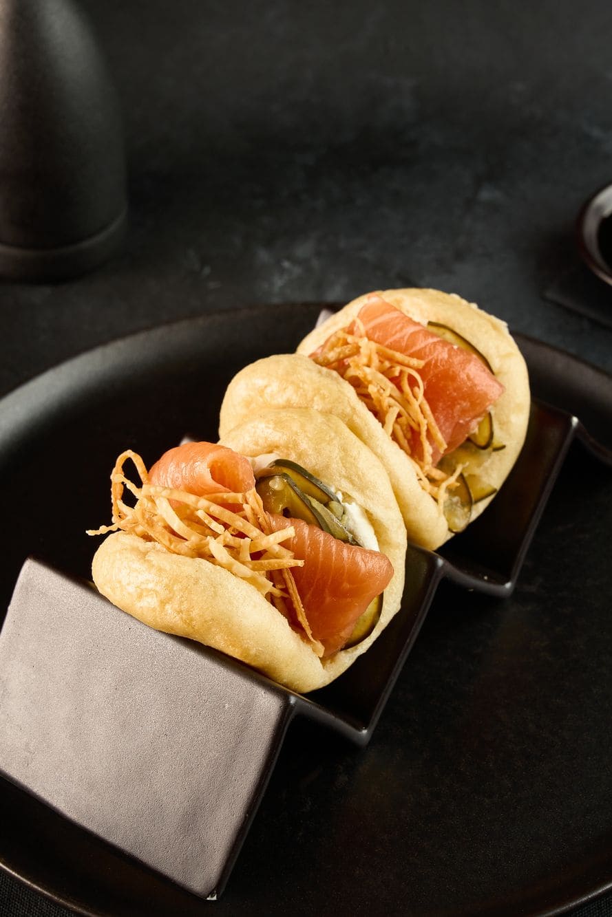 - Bao de salmón: Salmón acompañado de queso philadelphia, pepino encurtido y gyozas crocantes.