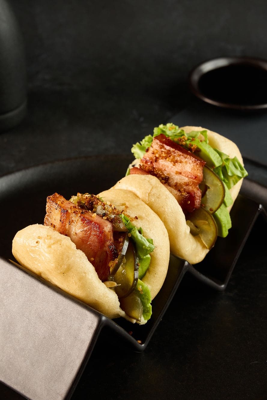 - Bao de tocino: 2 Baos de tocino ahumado acompañado de lechuga, aguacate, pepino encurtido y quinua crocante.