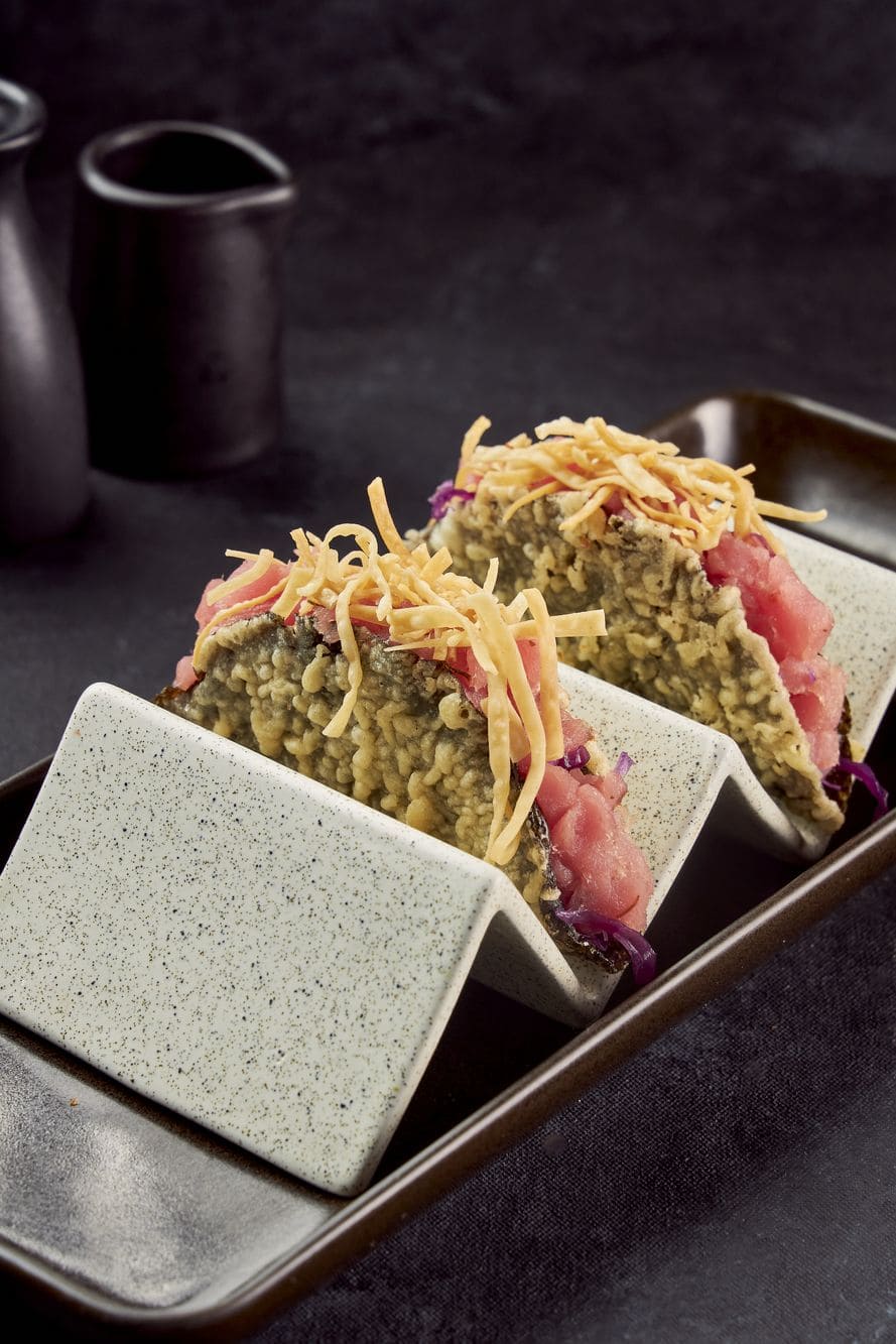 - Nori taco de atún: Alga nori crocante con arroz, atún fresco, gyozas crocantes y repollo encurtido: