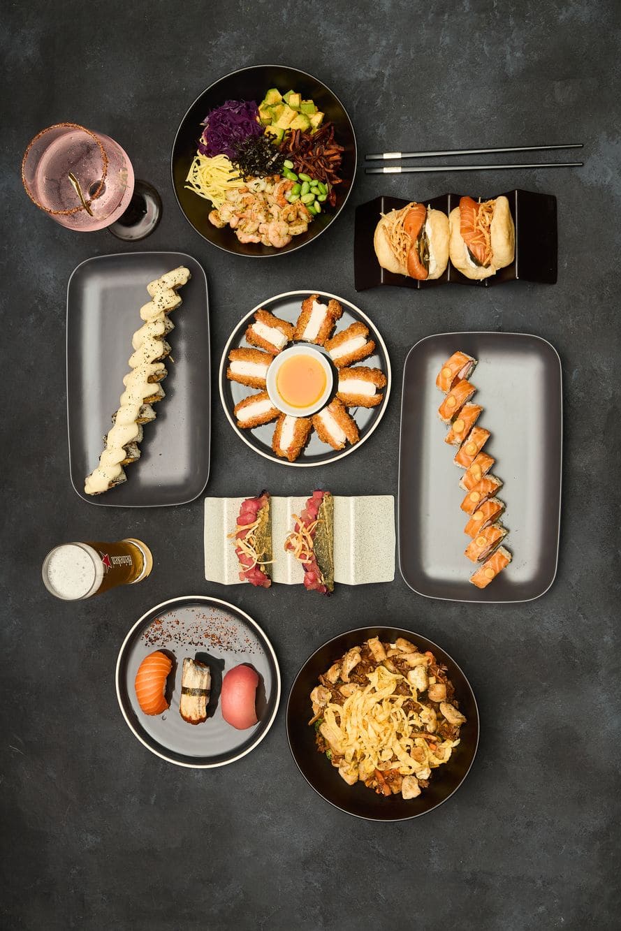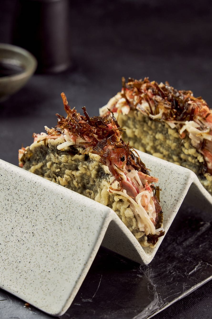 - Nori taco mixto: Alga nori crocante con arroz, palmito de cangrejo, salmón, aguacate y puerro crocante.