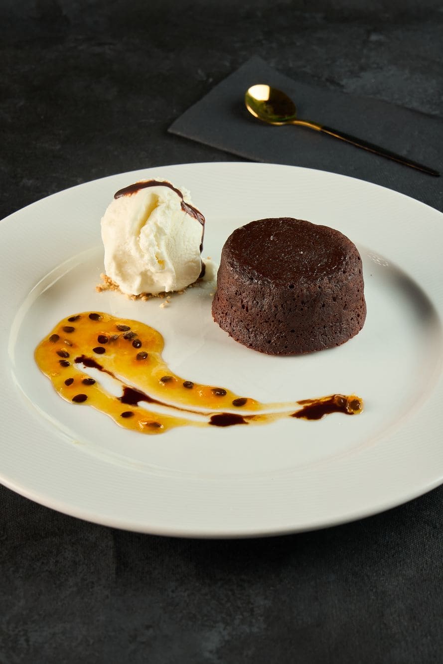 - Torta de chocolate: Torta de chocolate caliente acompañada de helado y maracuyá.