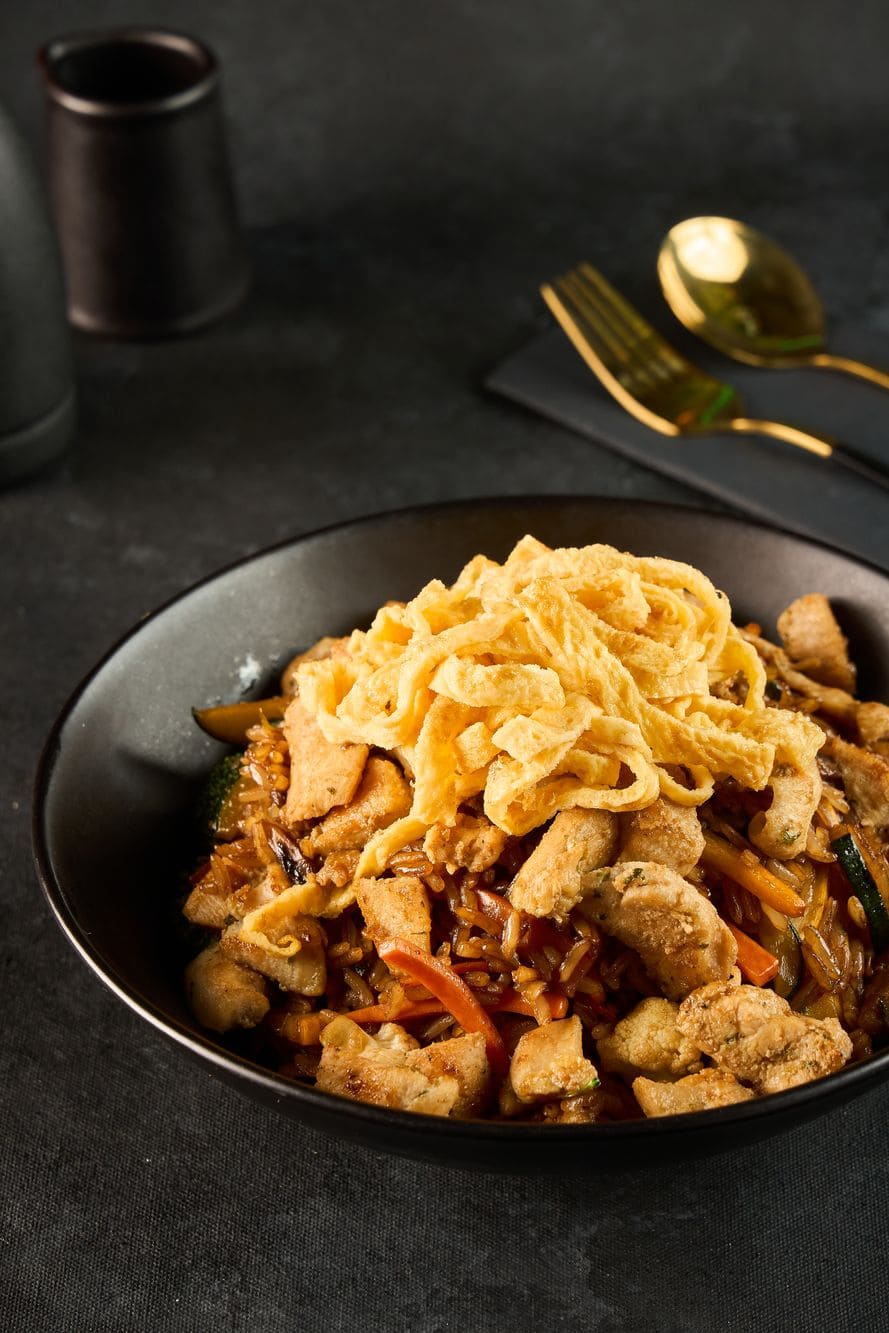 - Chaufa de pollo: Chaufa de pollo acompañada de mix de zuquini, calabacín zanahoria, champiñón, brócoli, coliflor, cebolla y tortilla de huevo.