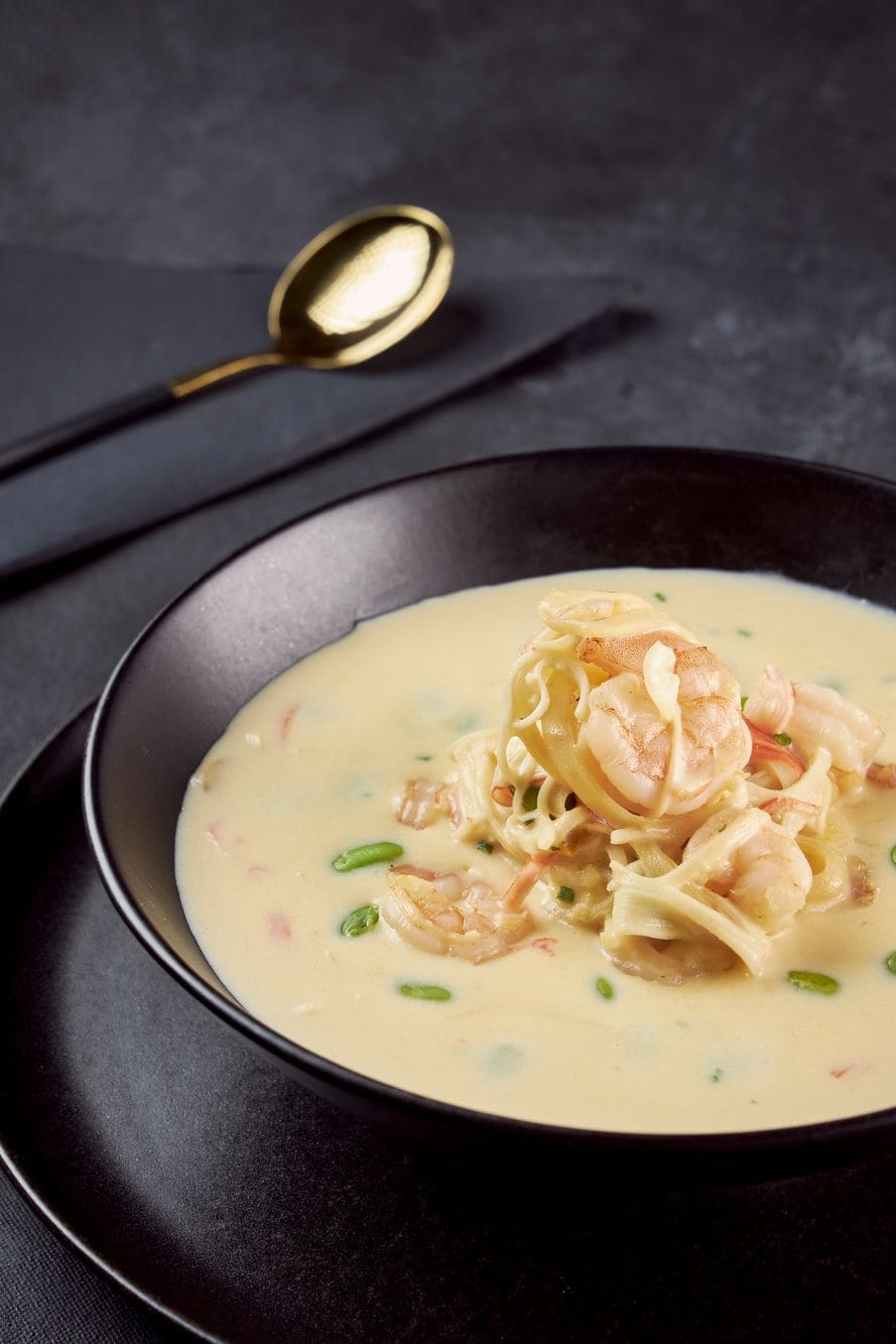 - Crema de mariscos: Edamames, camarón, palmito de cangrejo, calamar, mejillones
