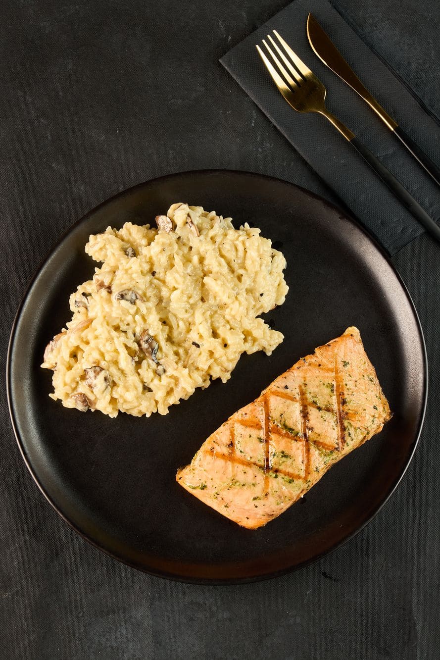 - Cremoso de salmón: Arroz cremoso acompañado de champiñones y cebolla y salmón
