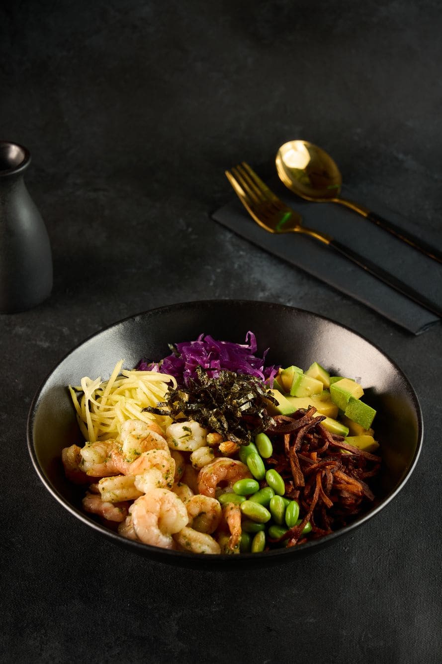 - Poke de camarón: Arroz de sushi acompañado de camarón, mango, edamames, aguacate, zanahoria crocante y repollo encurtido
