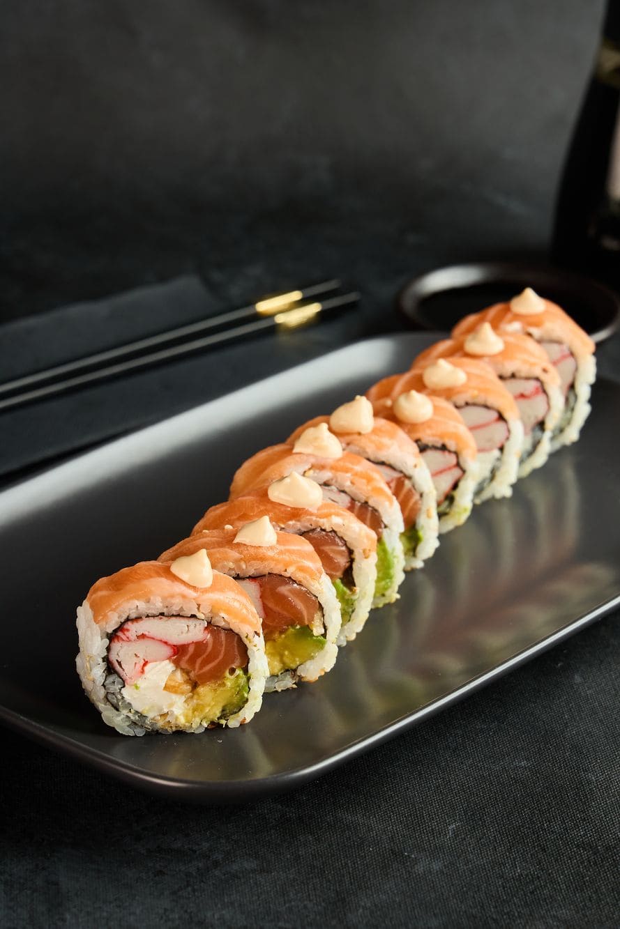 - Roll mixto slmon cangrejo: Relleno de salmón fresco, palmito de cangrejo, aguacate y queso philadelphia, cubierto de salmón acompañado de una salsa spicy mayo y gyosas crocantes.