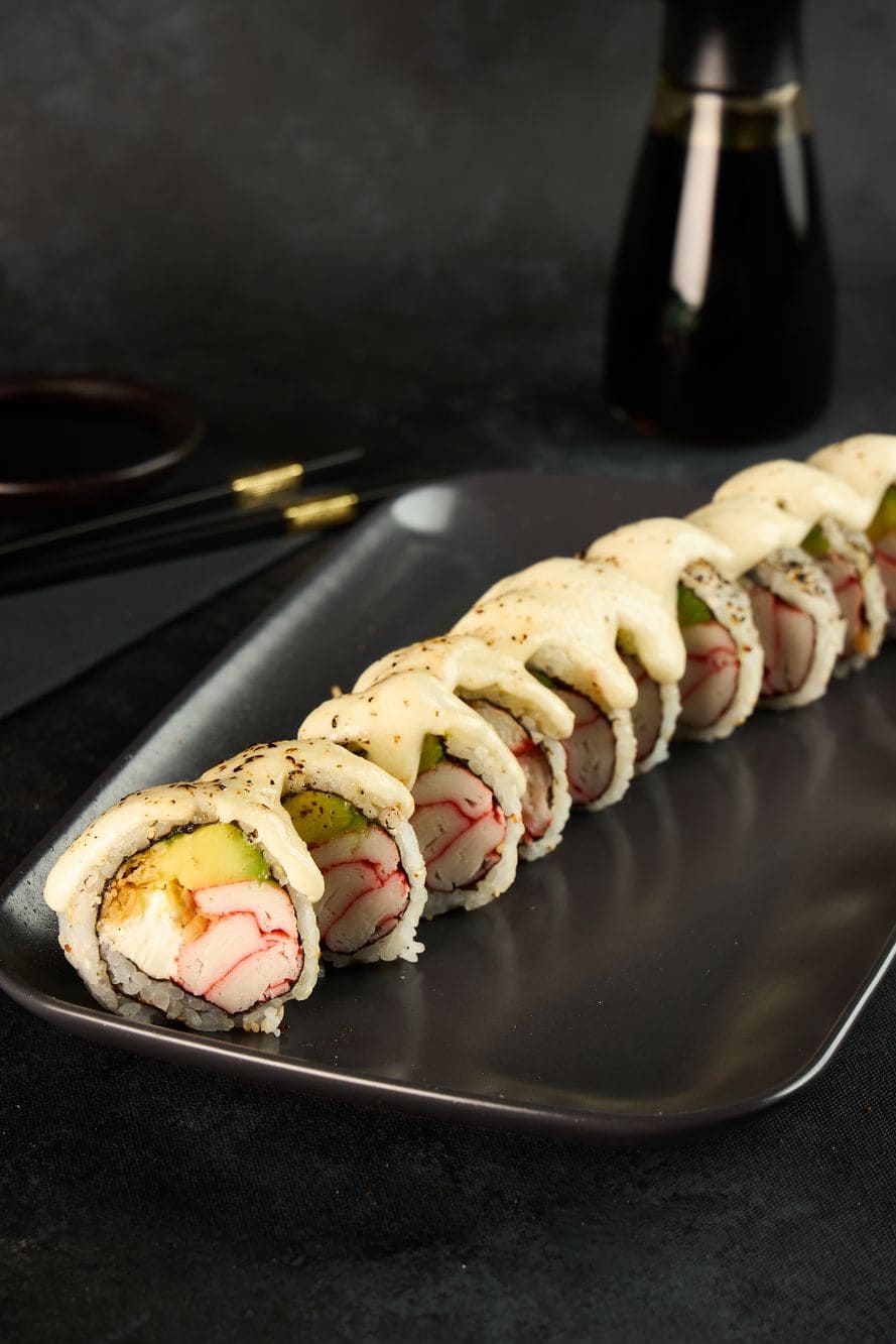 - Roll cangrejo flameado: Roll relleno de palmito de cangrejo, gyozas crocantes, aguacate y queso philadelphia, cubierto de salsa parmesana flameada.