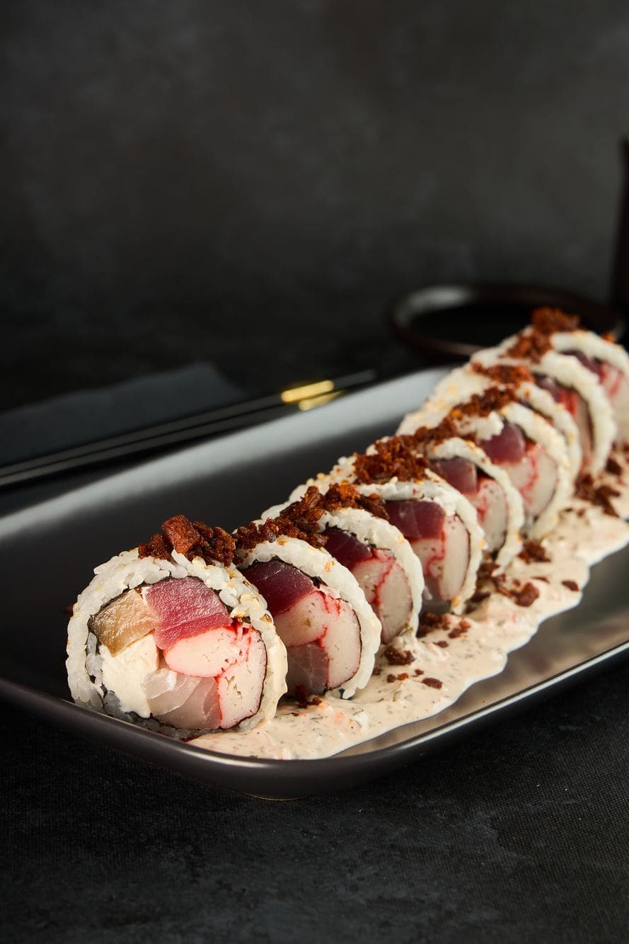 - Roll mixto tilapia-atún-cangrejo: Roll relleno de atún, tilapia fresca, palmito de cangrejo, yacon y queso philadelphia acompañado de salsa acevichada y zanahoria crocante.
