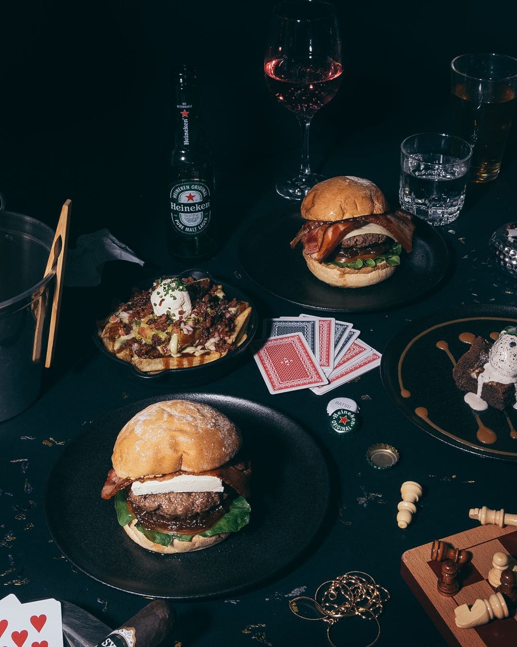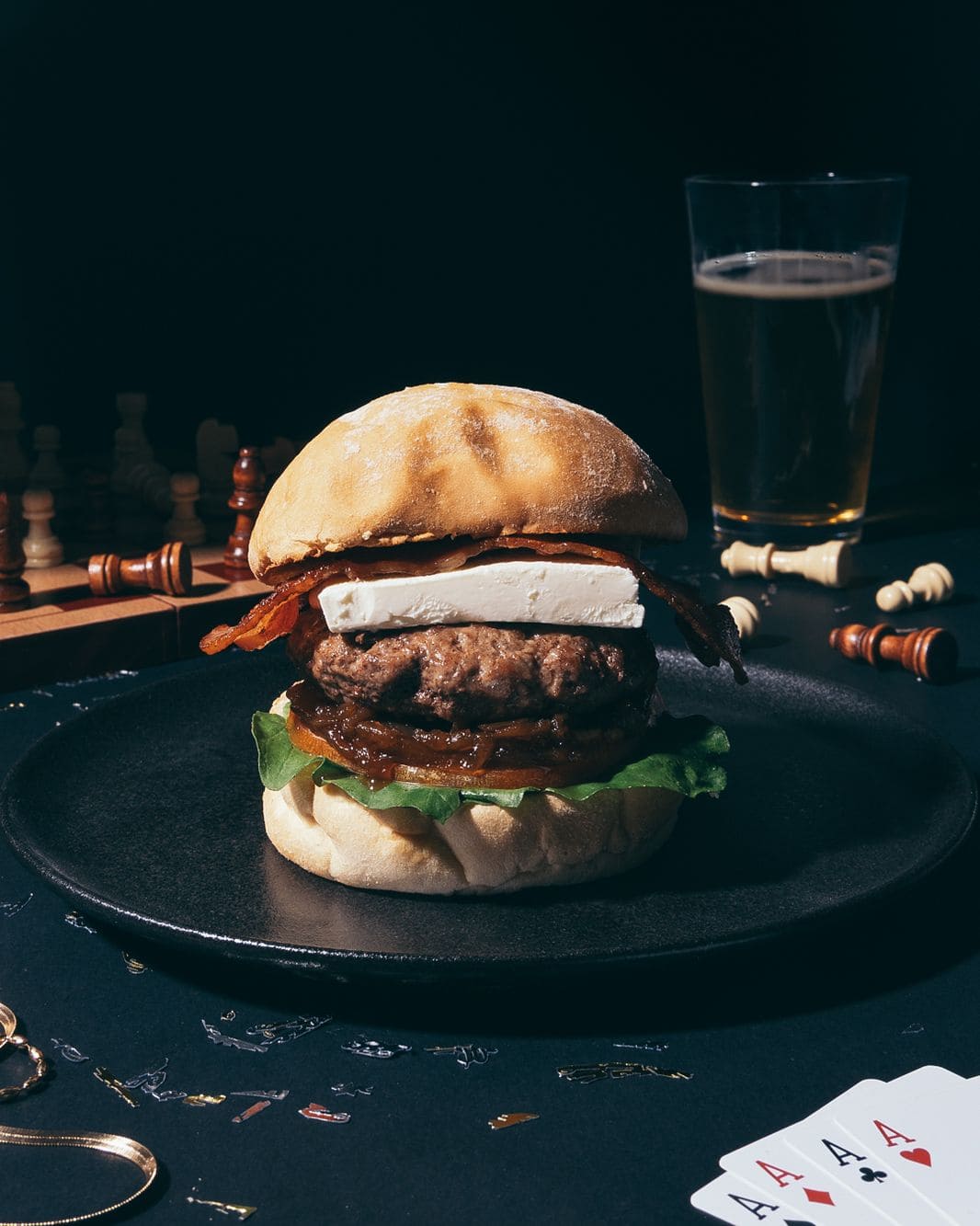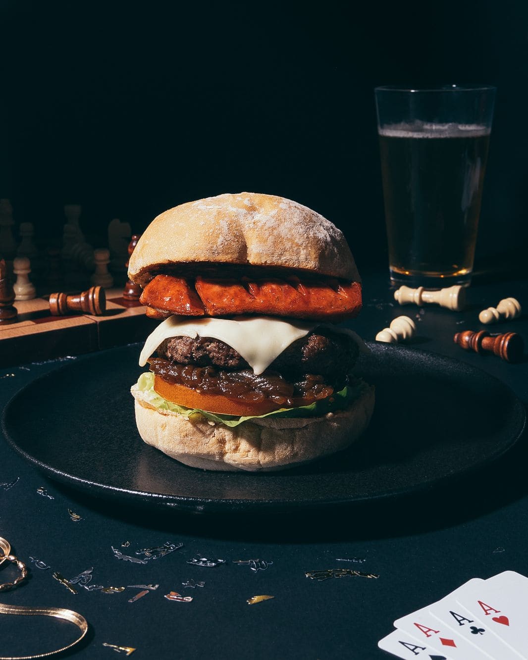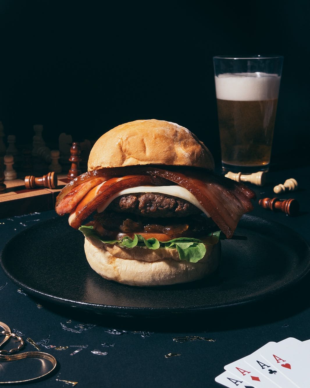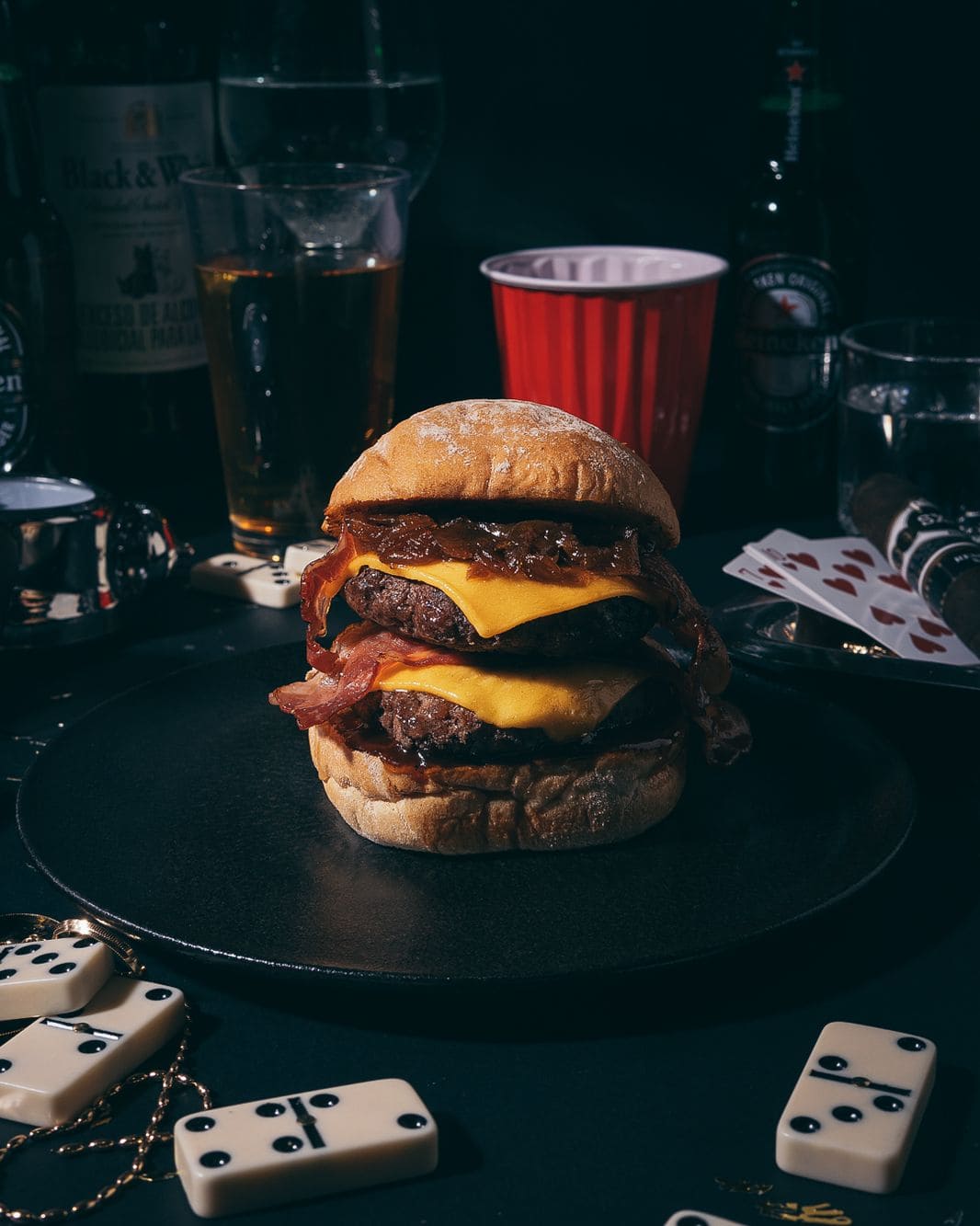 - Hamburguesa ultra cheese and bacon: La hamburguesa más generosa de la carta con dos carnes de 150g cada una, doble queso cheedar, tocineta ahumada y seleccionada, pan campesino artesanal, la cebolla caramelizada en whisky insignia de la casa y salsa bbq en burbon.