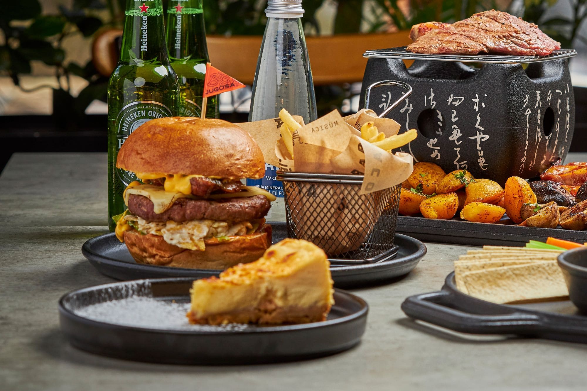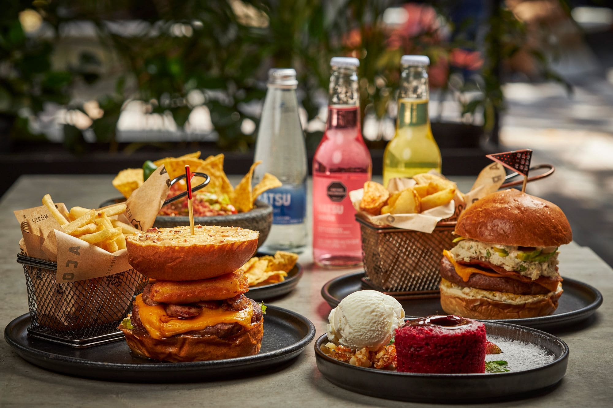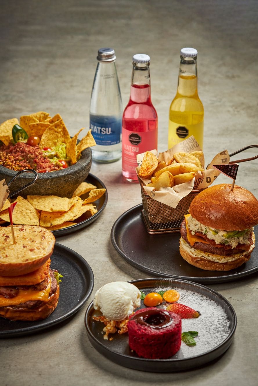 - Hamburguesa bacana: Carne de res 150g, queso americano, tocineta crujiente, virutas de plátano, relish de jamón serrano, burrata en sweet chilli, mezclum de lechugas y salsa burger en pan de papa. Acompañada de papas a la francesa, cascos o ensalada.