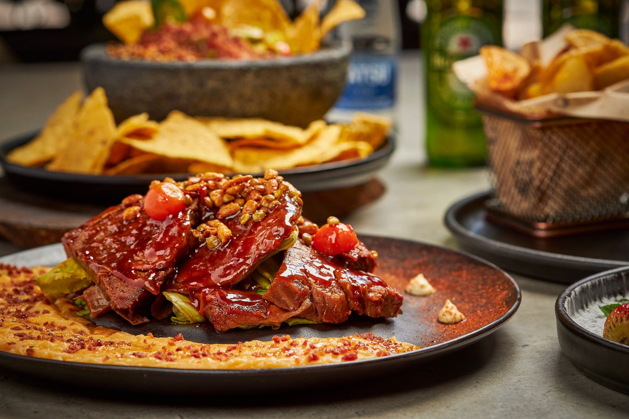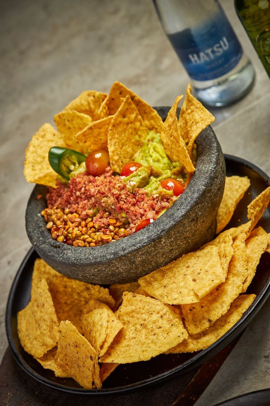 - Guacamole a la piedra: Pulpa de aguacate macerada en molcajete, con trocitos de mango de cosecha, especiado levemente , y terminado con polvo de tocino y salsa sweet chili