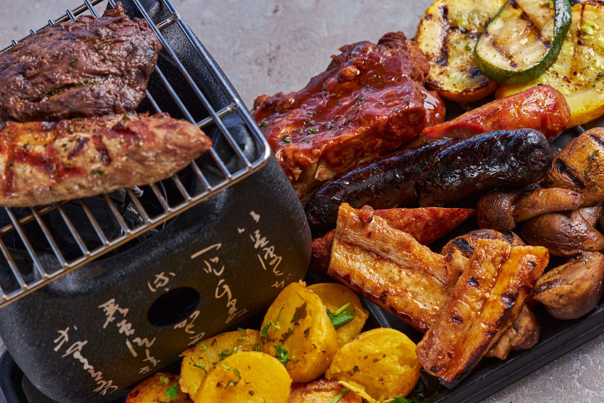 - Parrillada barbacoa: Un festín de solomito, anca de cerdo, chorizo de la casa, morcilla y costilla de cerdo, acompañado de vegetales parrillados y papas criollas al limón con cilantro. ( esta opción solo eliges 1 por menú)