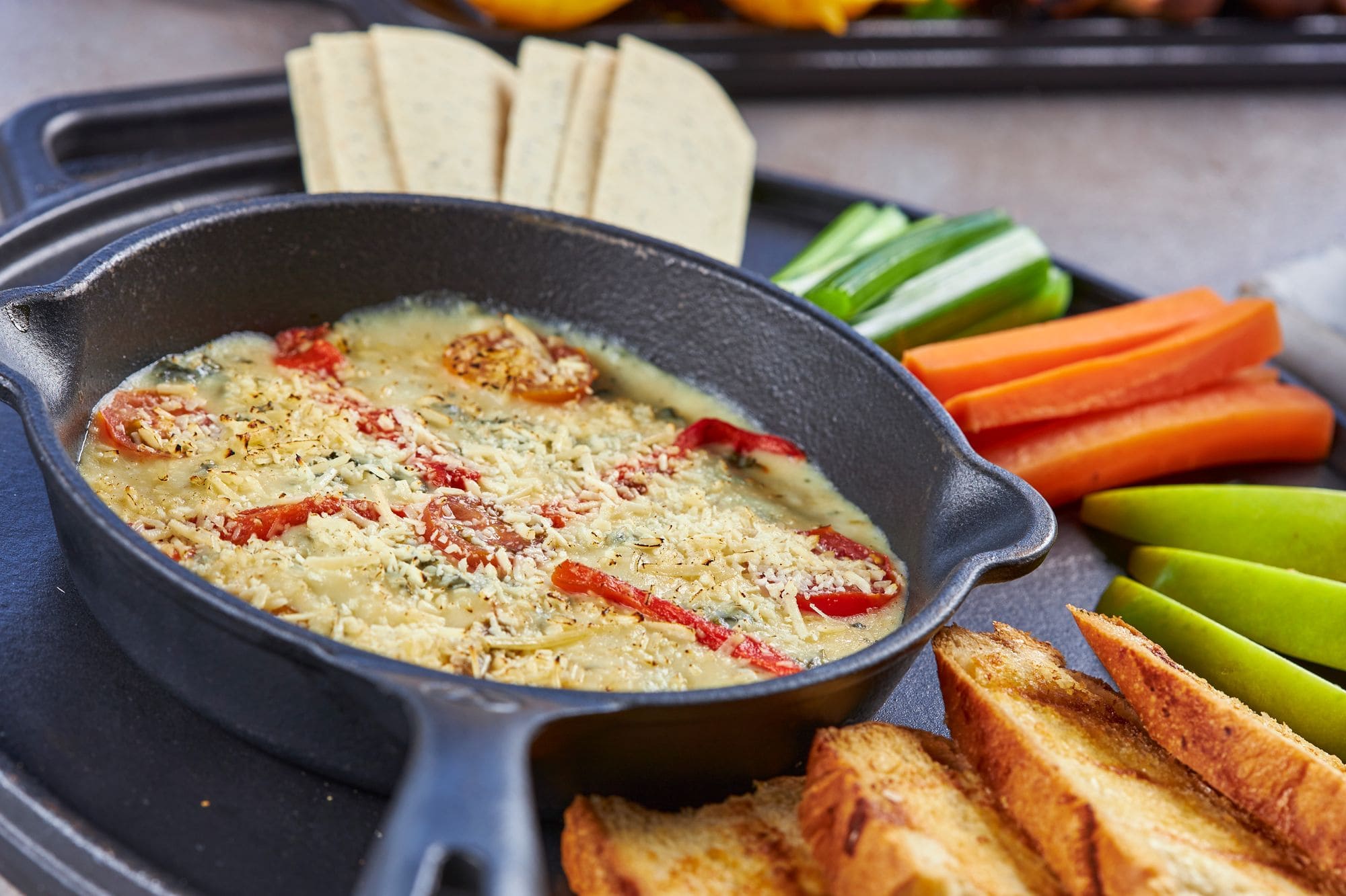 - Pa dipear: Deliciosa crema de espinacas con quesos y especias, acompañada de pimentones tatemados, tejas de amapola, pan baguette y bastones de apio, zanahoria y manzana verde.