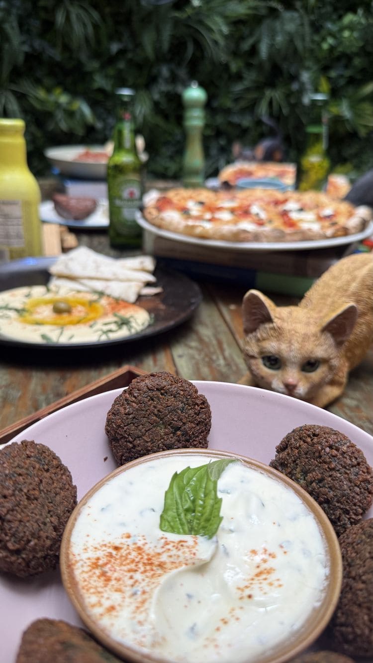 - Falafel: Croqueta frita tradicional de Oriente Medio, elaborada con garbanzos, perejil, cilantro, y especias acompañadas de un dip de yogurt griego, hierbabuena y queso crema.