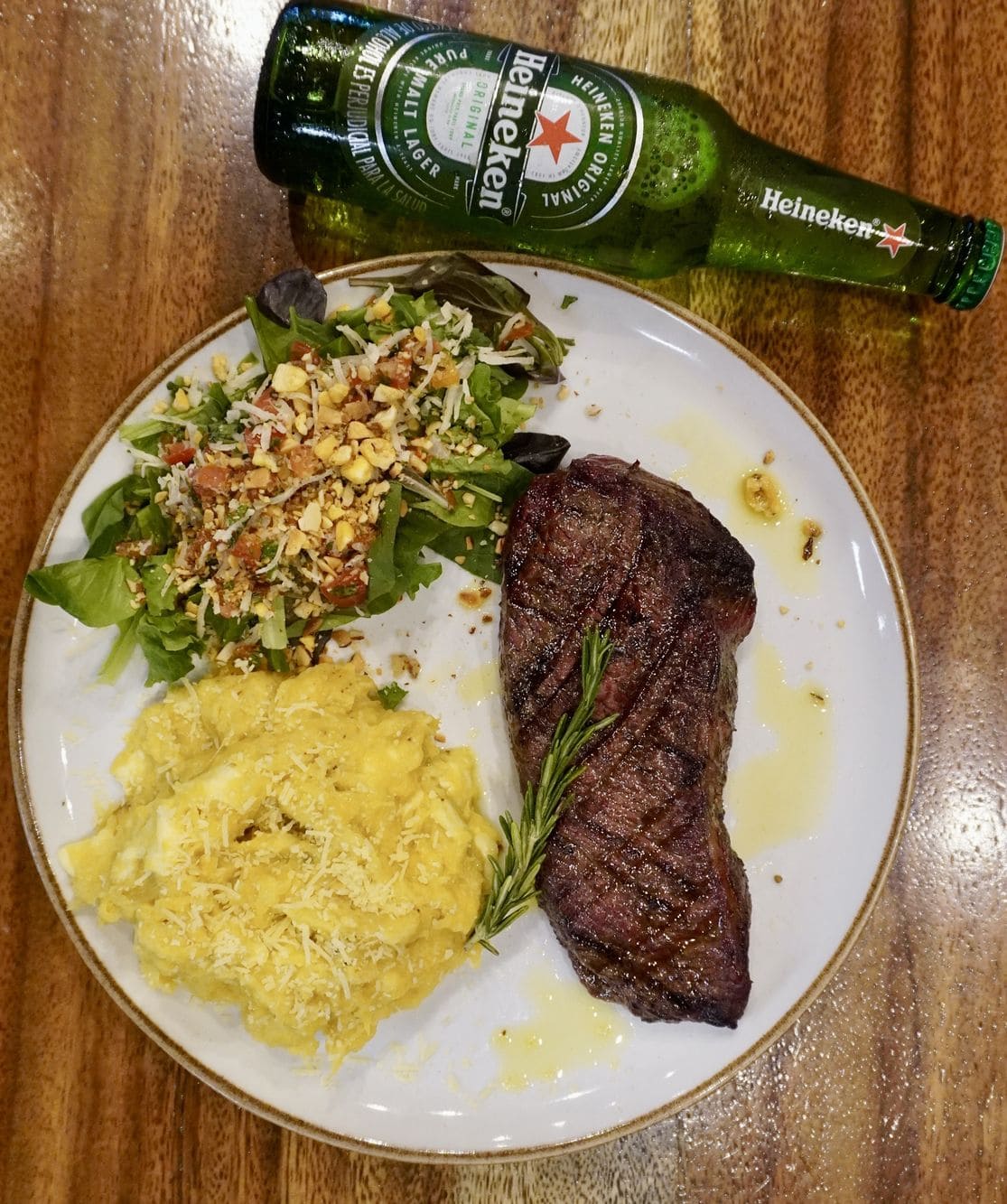 - Tapa de cuadril asada: Tapa de cuadril cuidadosamente asada al fuego alto sobre las parrillas del barril para lograr un exterior caramelizado y un interior jugoso. Servida en cortes generosos que resaltan el sabor profundo de la carne y su textura suave. Acompañada con 2 deliciosas guarniciones. Puré de plátano maduro cremoso con parmesano, que equilibra dulzor natural y salinidad en una guarnición suave y reconfortante o ensalada coco fresca con coco crocante y aderezo sambal que aporta un toque picante, acido y vibrante.