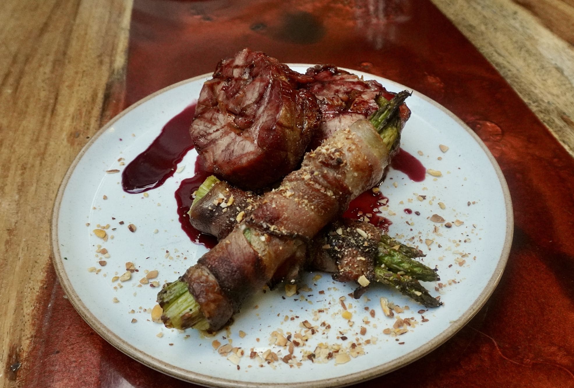 - Bondiola en rollo en salsa de vino tinto: Bondiola de cerdo braseada y cocinada lentamente en el barril, enrollada y rellena con chorizo y queso para concentrar su jugosidad, bañada en una elegante reducción de vino tinto que resalta los sabores profundos y caramelizados de la carne. Acompañada con 2 deliciosas guarniciones. Espárragos salteados en mantequilla de ajo, envueltos en tocineta crujiente, con un balance entre frescura vegetal y sabor ahumado o puré de papa cremoso con mantequilla y parmesano, de textura sedosa y sabor suave con notas salinas y umami.