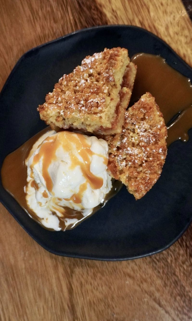 - Torta de almojábana con helado y salted caramel: Torta tibia de almojábana con textura suave y aroma a queso fresco, con relleno a elección de arequipe, guayaba o manzana con canela, acompañada de helado artesanal de vainilla gourmet y bañada con una sedosa salsa de salted caramel que equilibra dulzor y salinidad.