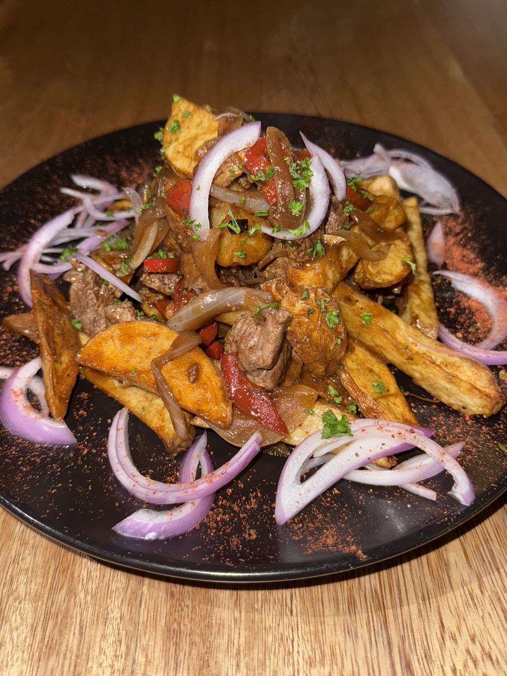 - Lomo saltado: Julianas de solomito de res, acompañados de vegetales frescos y papas, en una reducción de vino tinto y salsa oriental.