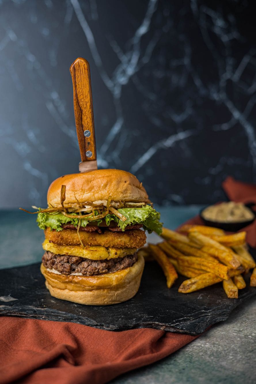 - Caniffala: Queso Philadelphia, acompañado de maduro frito, sobre nuestra carne de res artesanal, acompañado de tocineta Premium ahumada, vegetales frescos en balsámico y pan brioche de papa en bbq honestidad spicy y papas a la francesa.