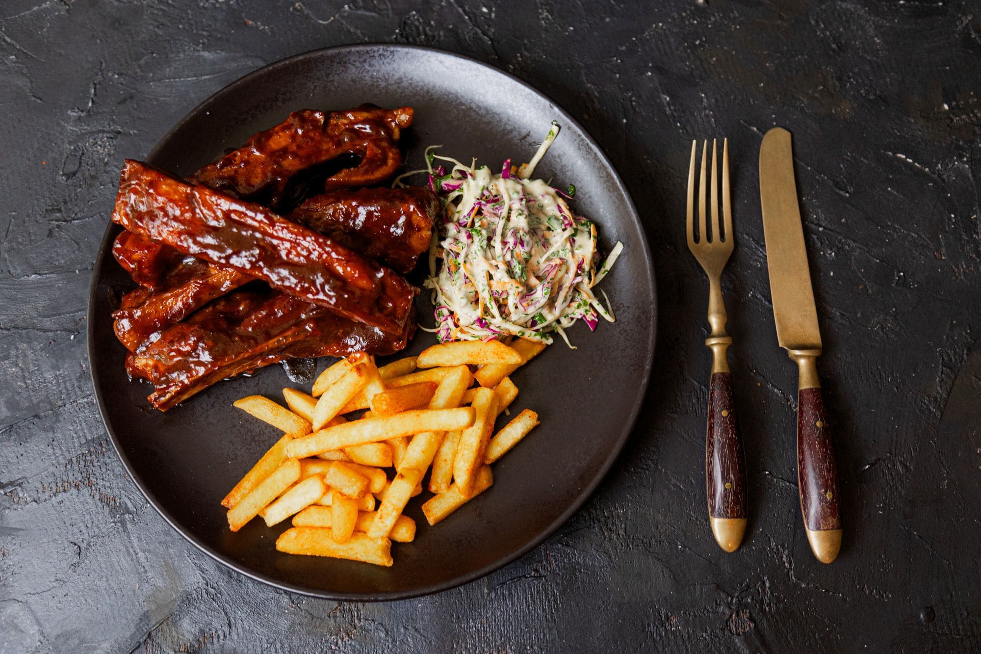 - Costillas San Luis: 400 grs de costilla San Luis preparadas en cocción lenta por 12 horas, en salsa bbq de tamarindo, acompañado de papas francesas y coleslaw