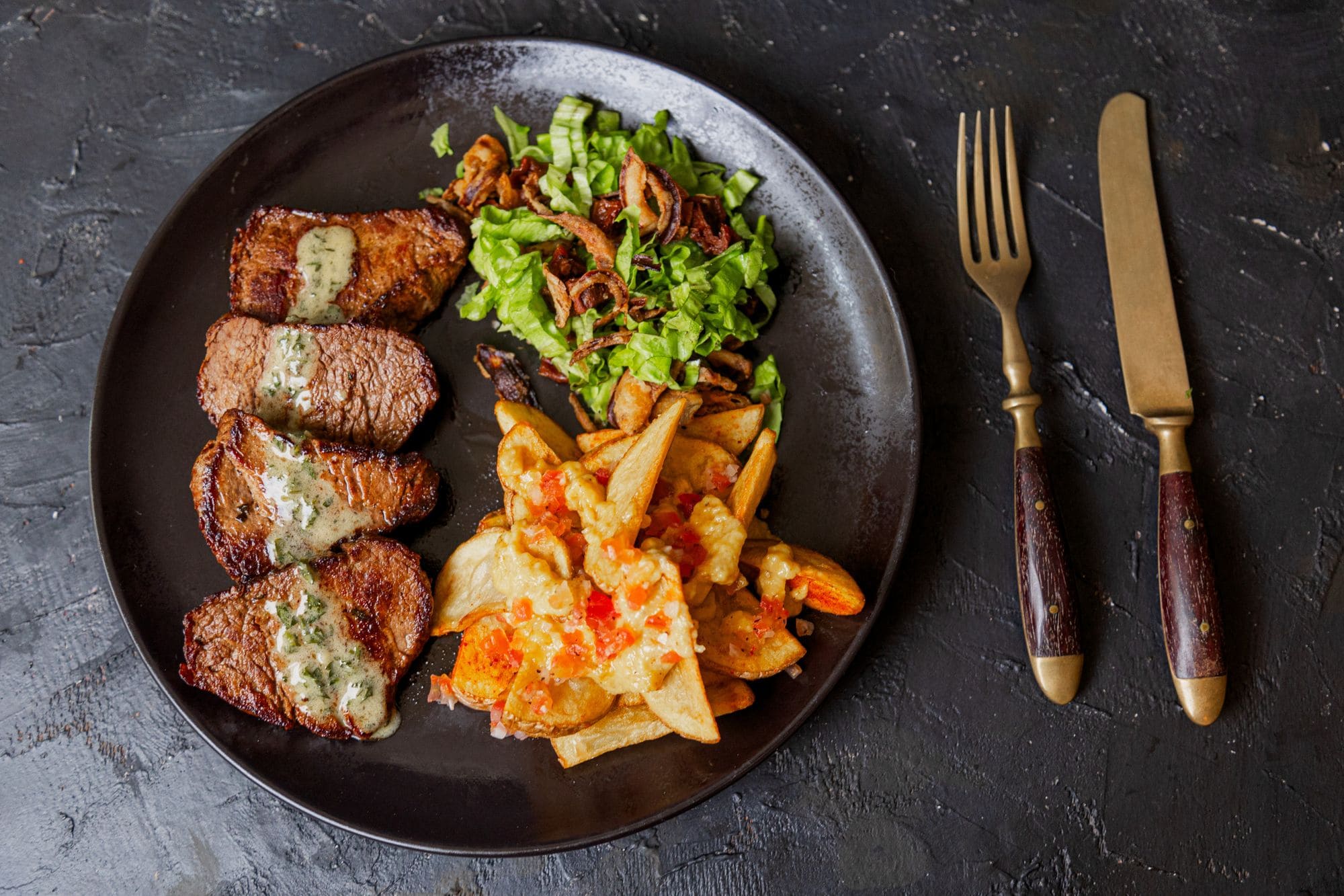 - Solomito: 300 gramos de medallones de solomito a la plancha, servidos con mantequilla especiada dijon, acompañados de papa rustica bañadas en crema de cheddar Maiz y pico de gallo con ensalada fresca.
