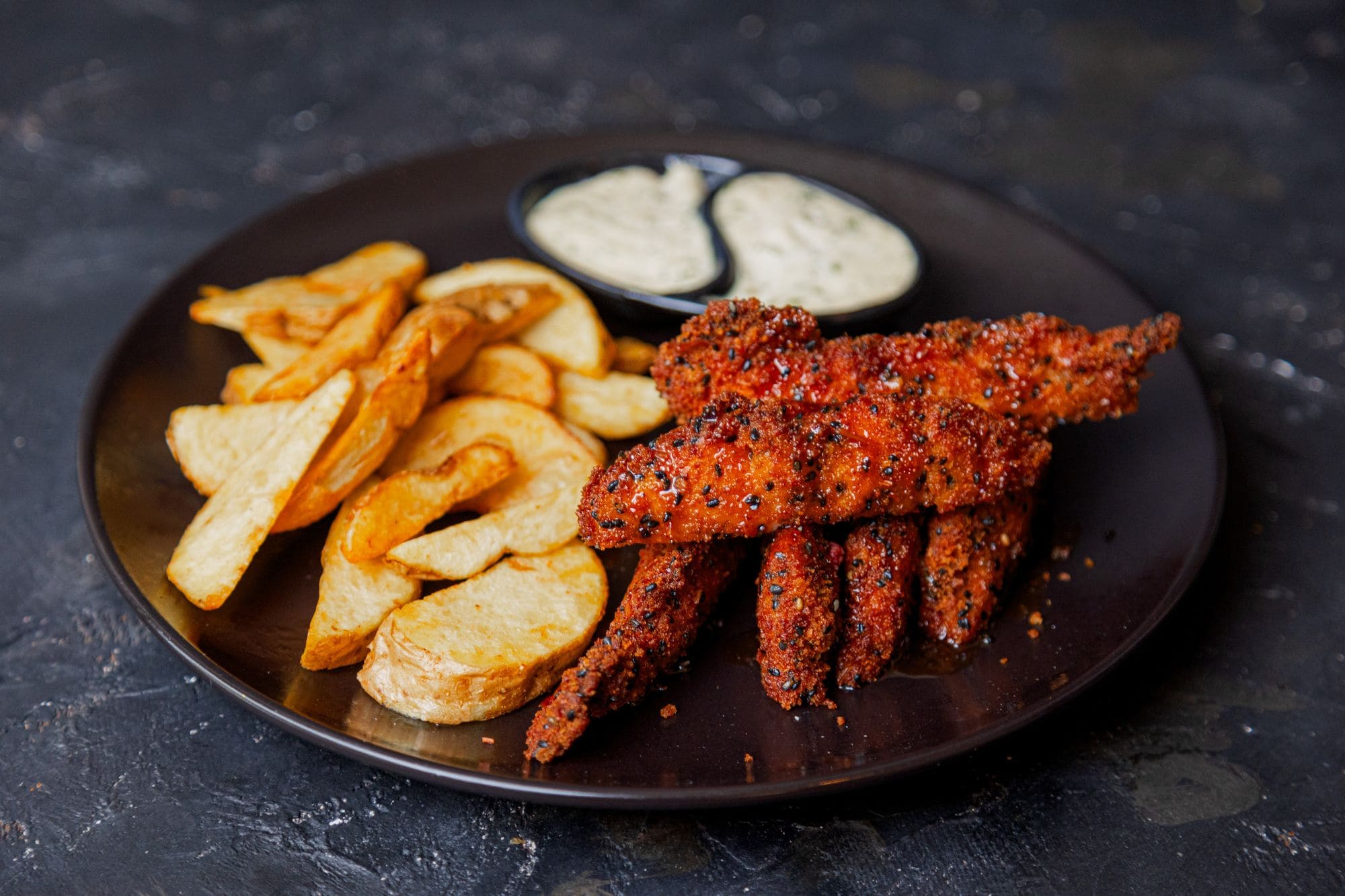 - Tenders de pollo: Filetes de pechuga de pollo empanizado, en mezcla de ajonjolí blanco y negro, bañado en salsa de miel chipotle, acompañado de papas en casco en salsa ranch.