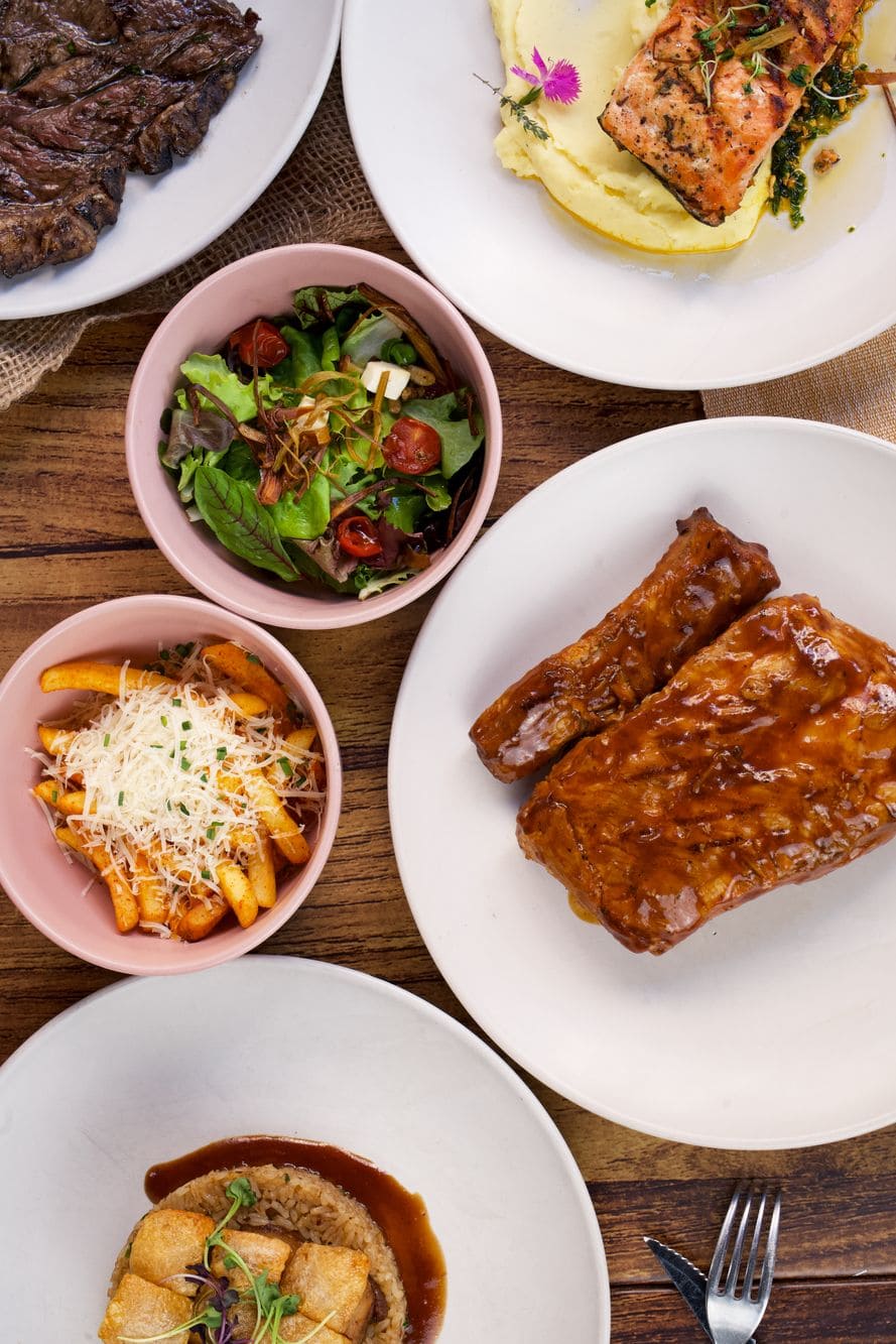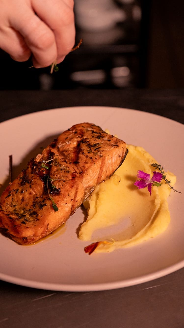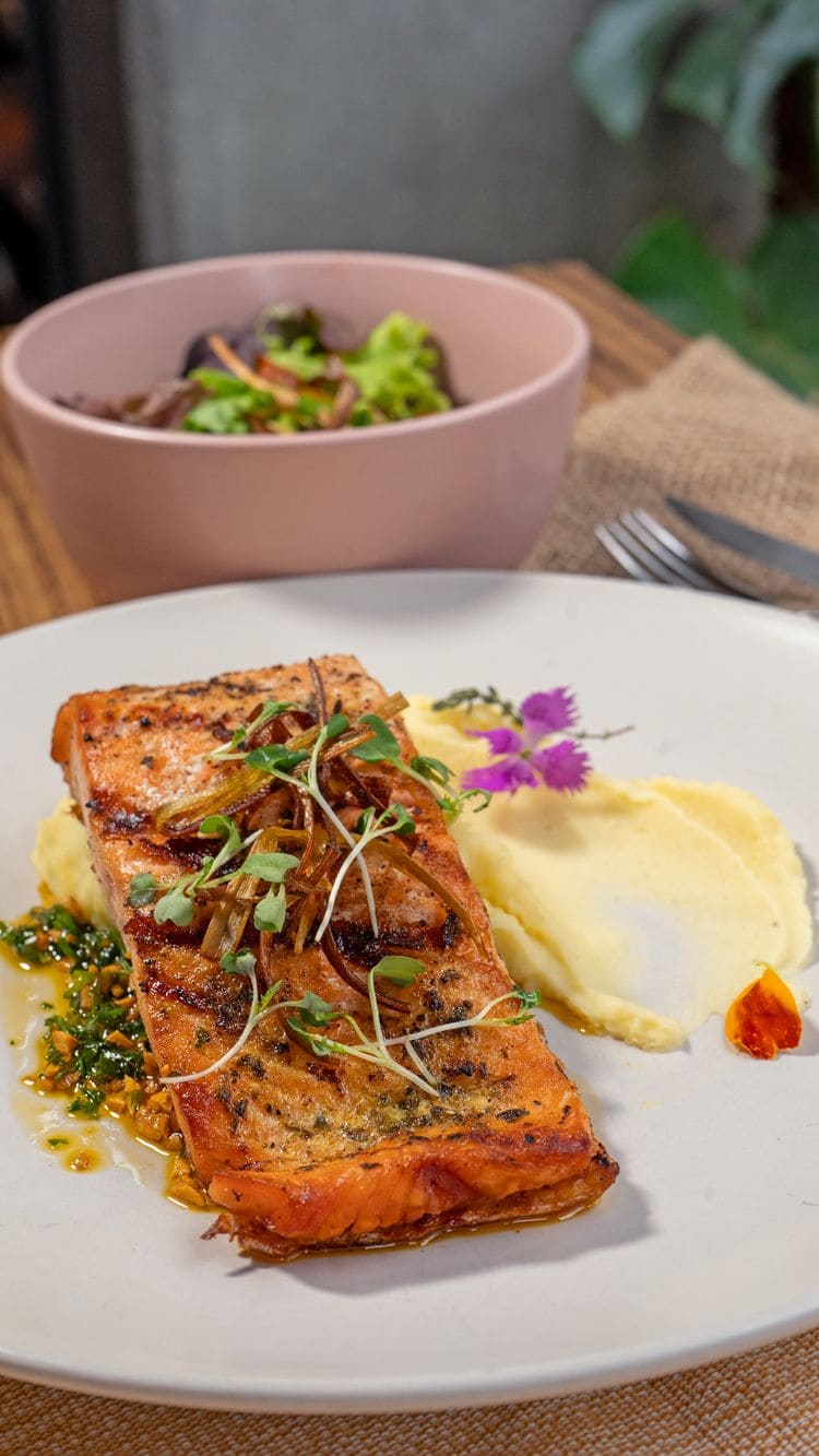 - Jugoso filete de salmón a la parrilla marinado en finas hierbas, acompañado de un suave puré de papa y finalizado con un aceite de achiote y ajo rostizado, limón y perejil. Servido con ensalada de la casa.